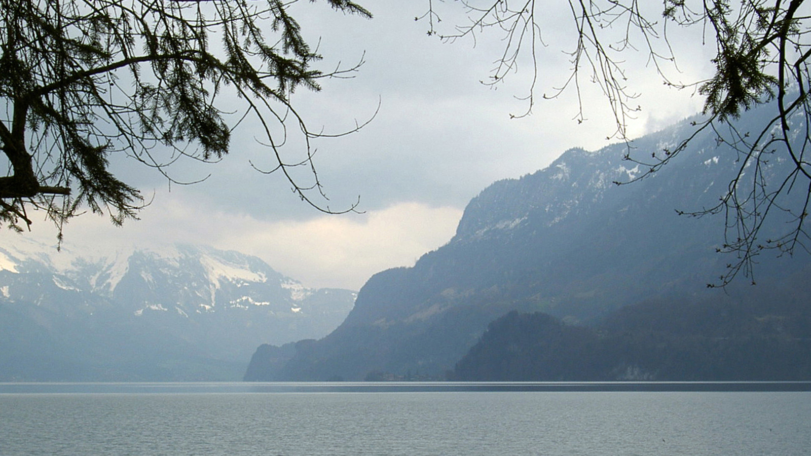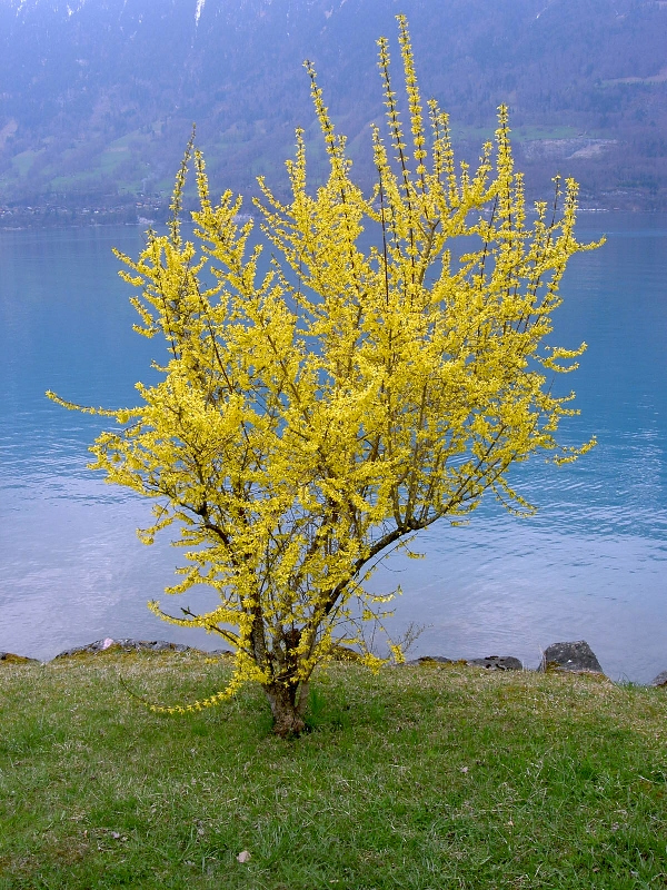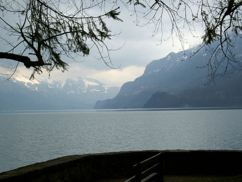 Nach einem Blick auf Iseltwald wieder hinunter zum See; frühlingshaft am Wasser entlang bis Bönigen. Auf einer Parkbank kurze Pause mit Blick zurück auf die Steilhänge, die ich in den letzten Stunden hinter mich gebracht habe.