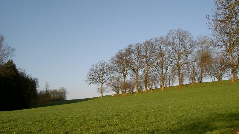 Befriedigt laufe ich weiter, entlang der La Broye bis und durch Moudon. Nach einem Flugplatz hinter Moudon einsamer Hof, Maufay. Von weitem sehe ich: drei (3!) Hunde versperren mir den Weg. Ein kleiner, mittlerer und ein großer Schäferhund, der beim Näherkommen auch gleich mit drei Riesensätzen auf mich losspringt. “Jaaaaaaaaaaaa”. Er schnuppert kurz, läuft dann vor mir her. Die beiden Anderen sind uralt und würdigen mich nur mit müden Blicken. Hinauf in den Wald. Der Schäferhund vergewissert sich, dass ich ihm folge. Bin ja brav. Er geht allerdings auch den richtigen Weg. Im Wald eine Gabelung, kein Wanderzeichen, links ein Baum, quer über dem Weg. Ich entschließe mich, rechts zu gehen. Mein (!) Hund zwängt sich unter dem Baum durch. Ich ignoriere ihn. Dann kehrt er um, überholt mich, und läuft vor mir quer nach links durchs Unterholz. Er will mir wohl den Weg zeigen. Ich folge ihm, und bin wieder auf dem richtigen Pfad. Etwa eine halbe Stunde habe ich diesen Begleiter.