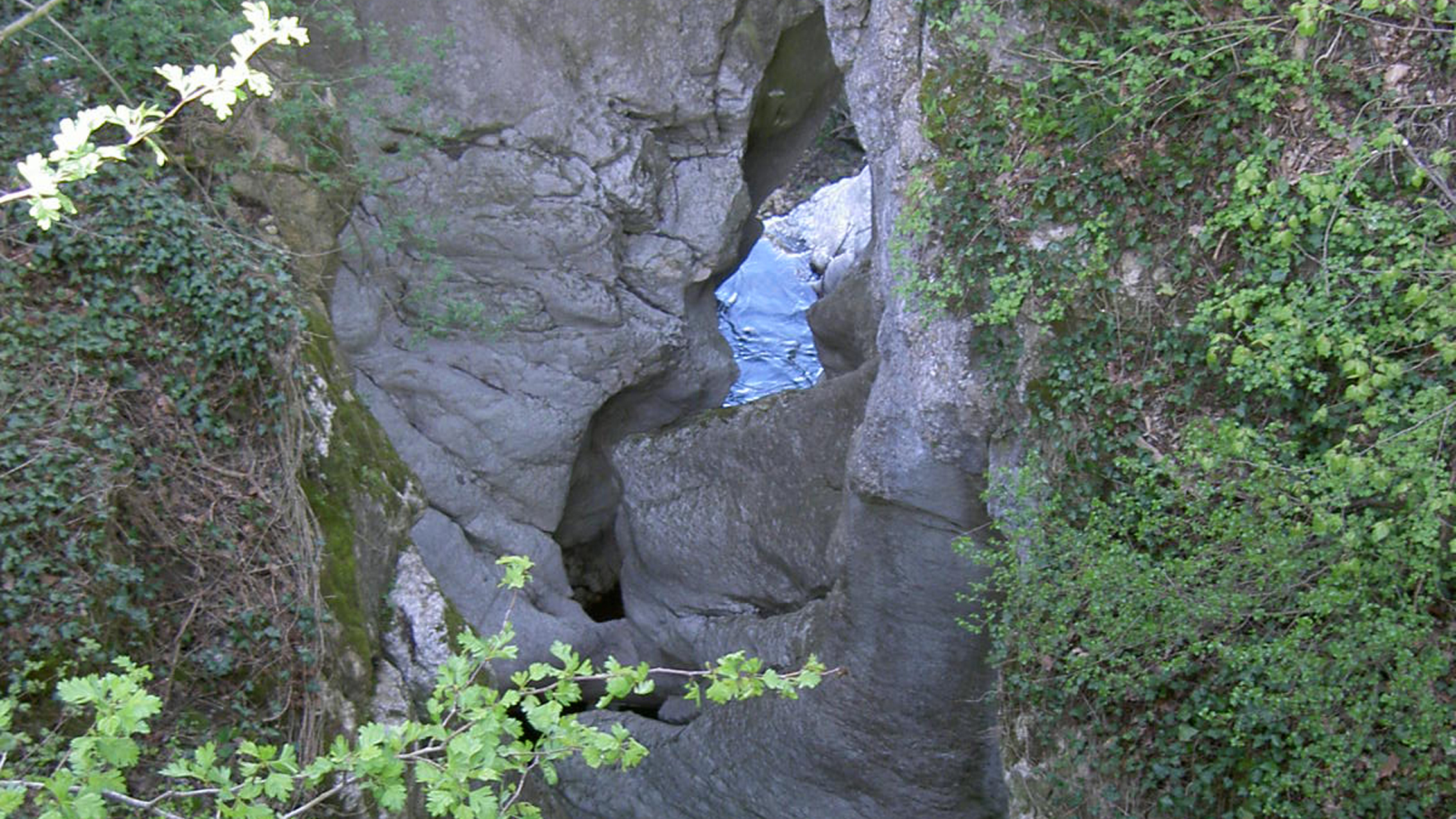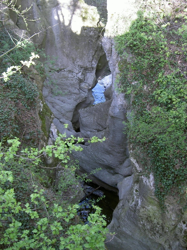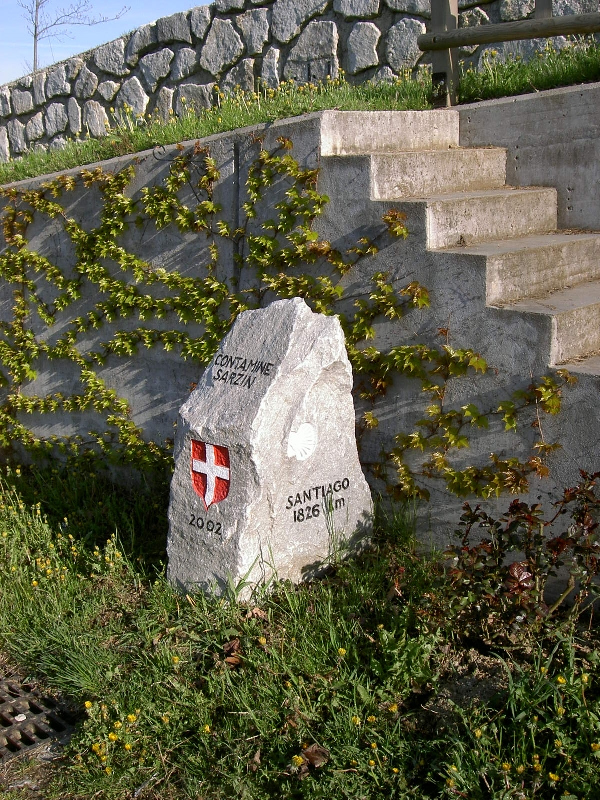 Weg zunächst sehr morastig, dann Asphalt, über Schotterweg 150m runter ins Tal. Eine Frau führt 2 weiße Hunde spazieren, hält sie fest, als sie mich sieht. Merci! Dann wieder steil rauf, 120m (Achterbahn, wie häufig auf dieser Tour), auf eine Höhe mit herrlicher Aussicht, aber noch 1826 km bis Santiago. Laudate , dann sehr steil wieder 200m runter, alte Brücke über tief ausgefräste Wildbachschlucht des Fornant.