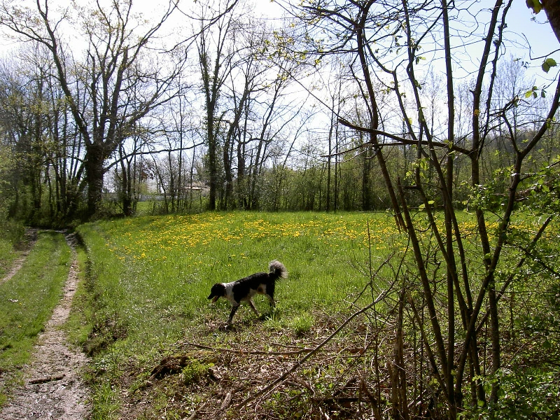 Langer, mühevoller Aufstieg über Wiesen und Felder, 200m. Bei einem Bauernhof am Ortsausgang schließt sich mir ein schwarzweißer Hund an. Greift sich immer wieder einen Stein oder ein Stück Holz, das er mir auffordernd entgegenhält. Herrchen hat aber keine Lust zum Spielen, will Hundchen eigentlich lieber wieder los werden.