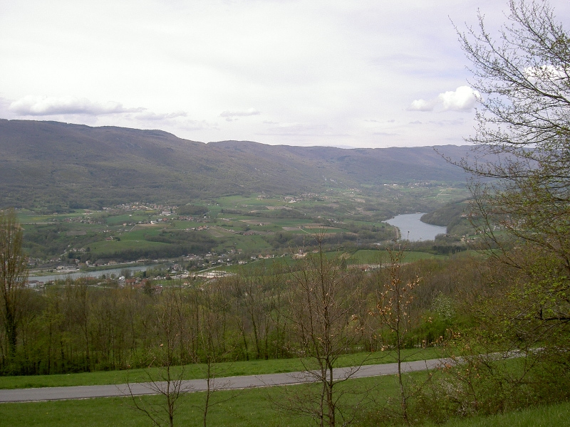 Heiß. Langer Weg, auf und ab, ein erster Blick auf die Rhone. Am Schluss 300m auf elend steilem Schotterweg hinunter zur Rhone nach Seyssel. Hotel du Rhone auf der anderen Seite. Restaurant geschlossen, Hotel Nebeneingang. Ich öffne die Tür, ein schwarzer Riesenhund stürzt die Treppe hinunter, umkurvt mich einmal und legt sich hin. Am dunklen Treppenpodest verhärmte Frau an ihrem Schreibtisch, ihr muffiger Mann führt mich durch stockdunkle Flure und steile Wendeltreppen zu meinem Zimmer, Louis Quince, hat aber schon bessere Zeiten gesehen. Alles in dunkelrot und Gold, incl. der schwer geschwungenen Vorhänge. Aber schöner Blick auf das Seyssel auf der anderen Flußseite (politische Problematik aus der Geschichte wie Ulm/Neu-Ulm).