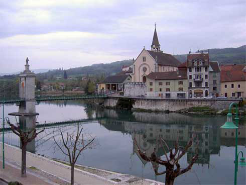 Dann schmaler Pfad wieder 200m steil hinauf. Oben schöner Höhenweg mit wunderbarer Aussicht, dann langer Abstieg nach Frangy. Einkaufen, Laudate in der Stadtkirche. Durch den Einkauf wird der Rucksack arg schwer. Dummerweise habe ich meinen Sonnenhut, verschwitzt wie er war, im Laden liegen gelassen. Also wieder zurück.