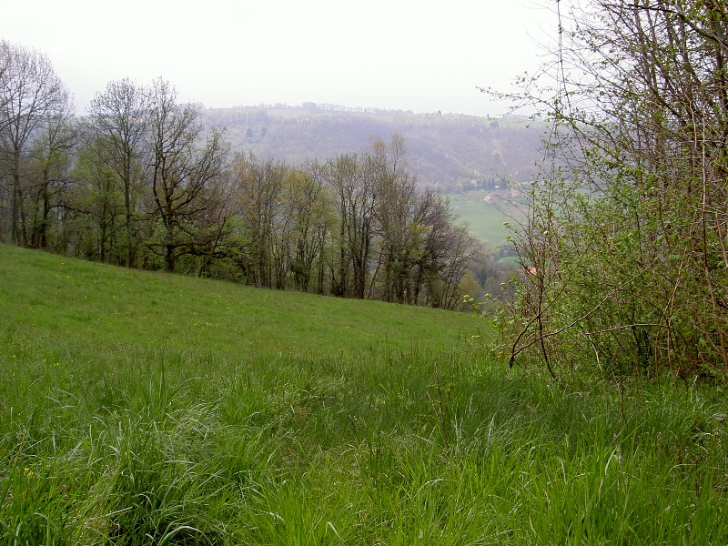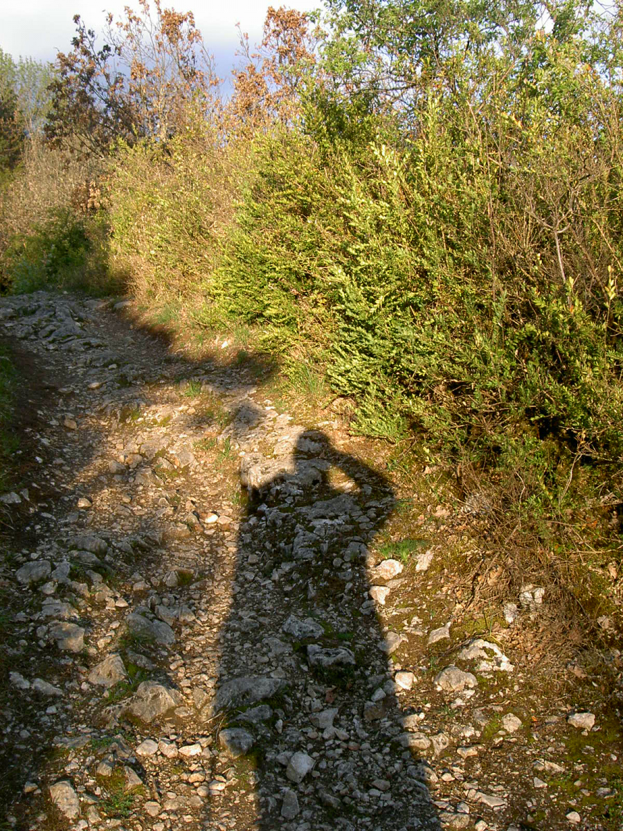 Am Waldrand in Wiese mit Blick auf die gegenüberliegenden Höhen (muss ich nachher rüber), lange Rast, freundliche Sonne, Brot, Wein, Wasser, Käse, Apfel, Schokolade. Hatte ich die schon erwähnt? Trotz 1-2 Tafeln täglich nehme ich kontinuierlich ab; was der Kondition und den Füssen sehr gut tut. Das Laufen macht überhaupt keine Mühe, hab keine Blasen, und komme zwar mit müden Füssen, aber durch die tiefe Daueratmung eigenartig erfrischt an.