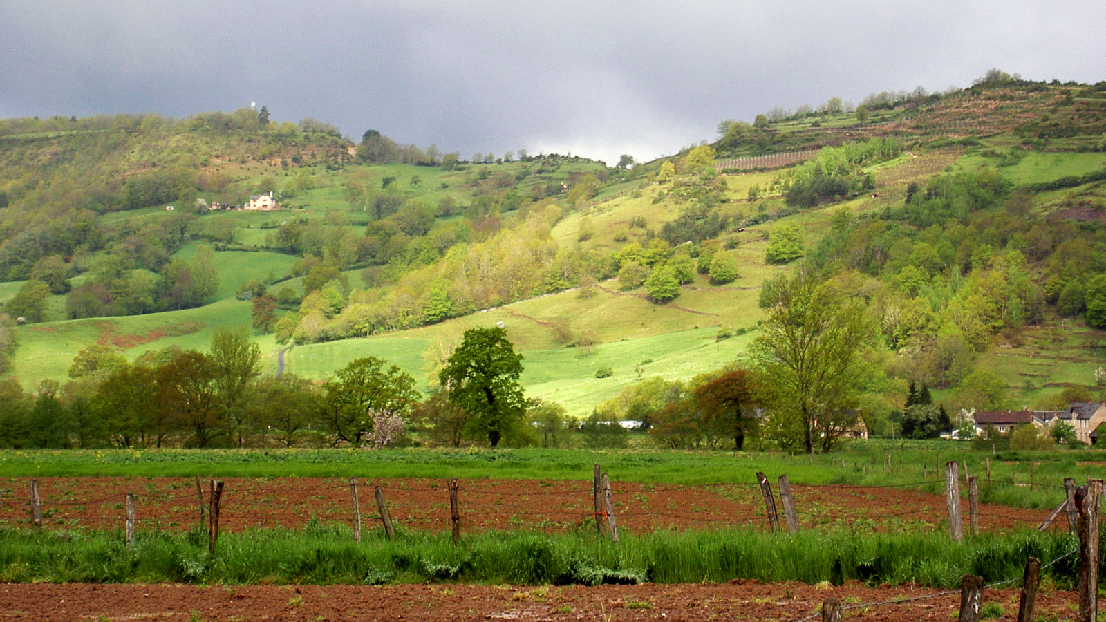 Über Hügel, Feldwege an lichten Wäldern vorbei, befreiende Ausblicke in freundliche Landschaften. Bei Golhinac wieder klatschnass vom Regenguss, aber die kleine Kirche ist offen,       Laudate . Regen, Hagelschauer und Sonne abwechselnd, Wasserwiesenweg mit Matschumgehung, während Sonnenloch an Picknickplatz feuchte Pause.