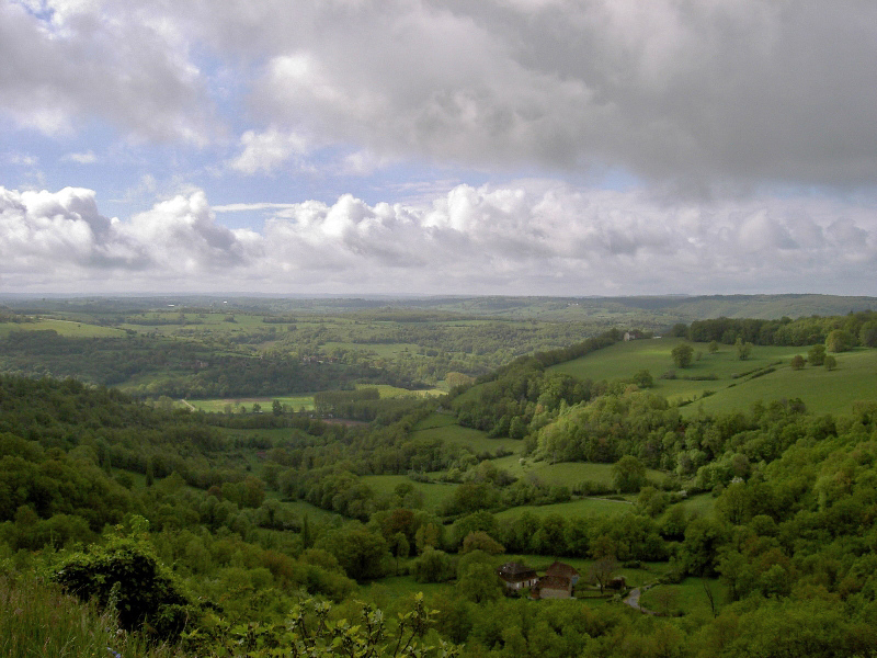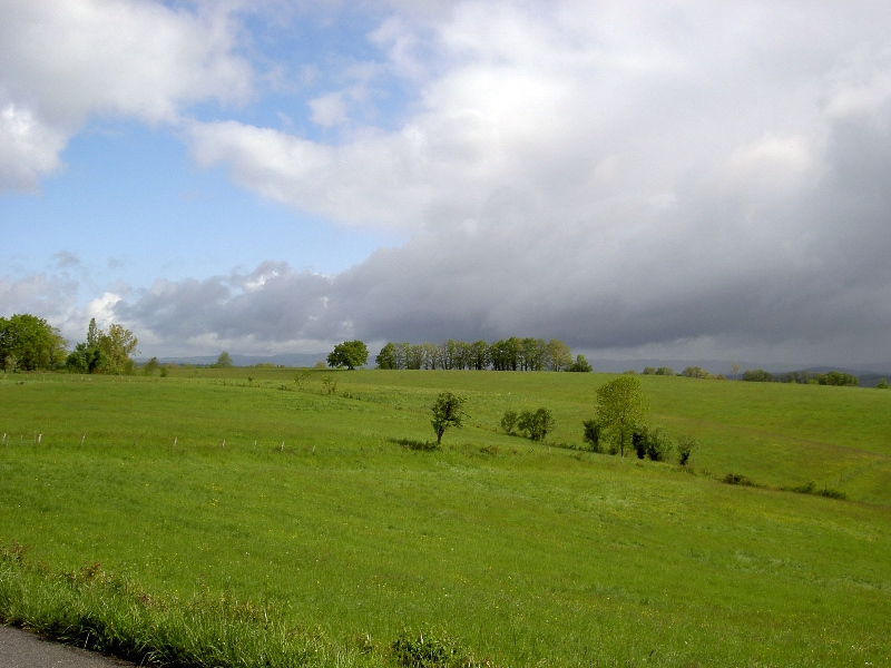 Schöner Höhenweg mit toller Aussicht. In Faycelles neugotische Kirche, Laudate . Gemütliche Straße Richtung Beduer, den Matschweg über die nasse Wiese habe ich umgangen. Regenschauer. Rast in Haltehäuschen, fühle mich heute etwas schlapp. Vielleicht hilft eine Tafel Schokolade.