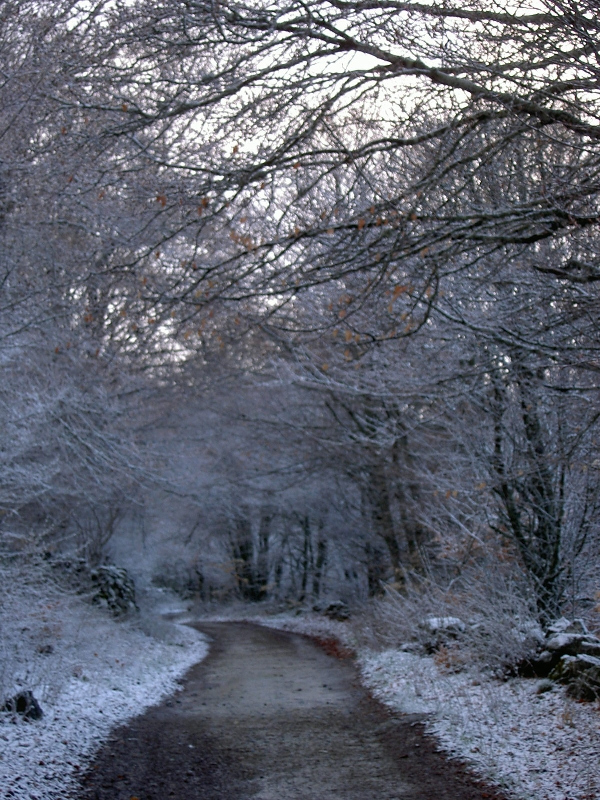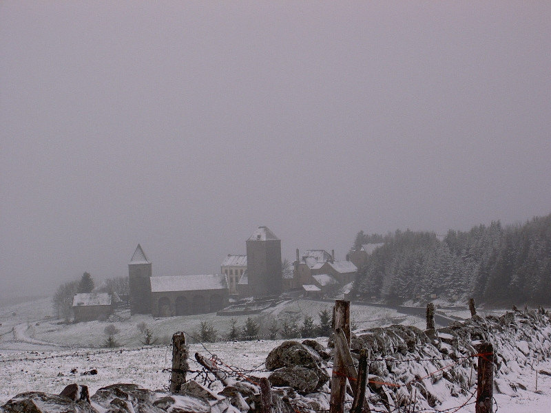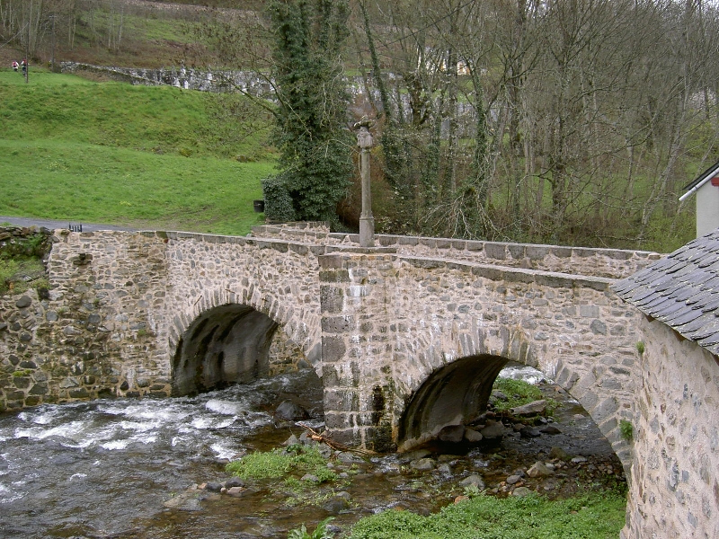 Im Gasthaus gönne ich mir ein Frühstück und wärme mich auf. Ahhhh, tut das gut! Eiskalter und nasser Abstieg, teilweise über sehr steile Rutschpfade, mehrere Pilger überhole ich. Schöne Kirche in St.Chely, aber mit betender Nonne, kein Laudate. Über alte Römerbrücke, dann wieder steil den nassen Hang hinauf.