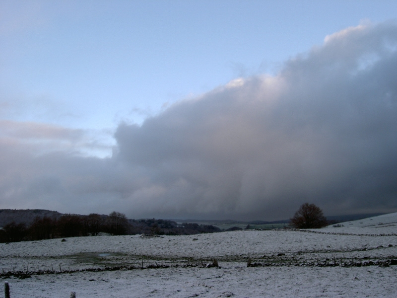 Heute wirds weit, also früh raus. Ich schaue aus dem Fenster und traue meinen Augen nicht: Schnee, alles weiß überzogen. Die Wolken scheinen nicht allzu dicht, denn manchmal sieht man einen blauen Schimmer, und im Osten kommt gelegentlich die Sonne mit ein wenig Licht durch die Wolken. Ich muss aber nach Westen, und da kommts doch sehr dunkel.