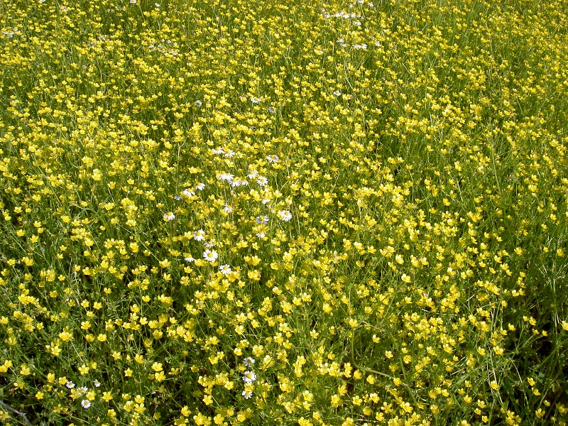 Füße erzwingen Pause. Ich gönn’ sie ihnen. Gelbe Blumenwiese, Weg abwechslungsreich, aber heiß!! Wieder Abzweig verpasst, wieder 2km umsonst. Was ist nur heute los? Soll das ‘ne Prüfung sein?