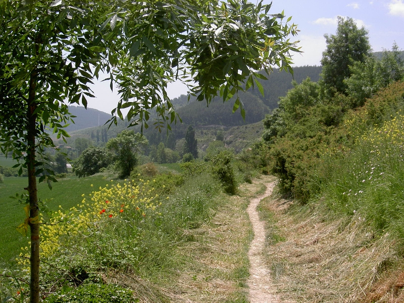 Kurz vor dem ErroPass nach drei Stunden kurze Pause; hab ich meinen Füssen versprochen, die täglich besser werden. Der rechte ist schon fast wieder hundertprozentig, der Linke strengt sich mächtig an, aufzuholen. Plötzlich überholt mich im Wald ein weißer Hund, rennt zwei Pilgern nach, die ich gerade gegrüßt habe und trottet hinter ihnen her.