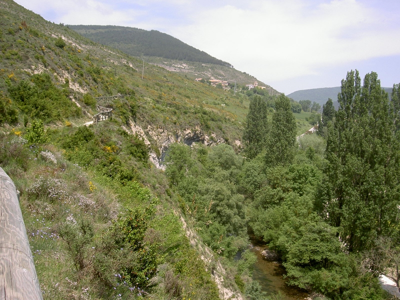 Ich starte wieder, gehe flott und hole die Beiden wieder ein und überhole sie. “Hola!” ab sofort folgt der Hund mir. Gehört also doch nicht zu den Beiden. Ein junger Mann, langes Wuschelhaar, überholt mich fröhlich. “Buenos Dias!” Der Hund folgt ihm, passt auch zu ihm. Kurze Zeit später liegt der junge Mann entspannt in einer Blumenwiese in der Sonne, der Hund hechelt im Schatten, wartet brav. Also das richtige Herrchen. In Zubirri kurz über die Brücke um einzukaufen.