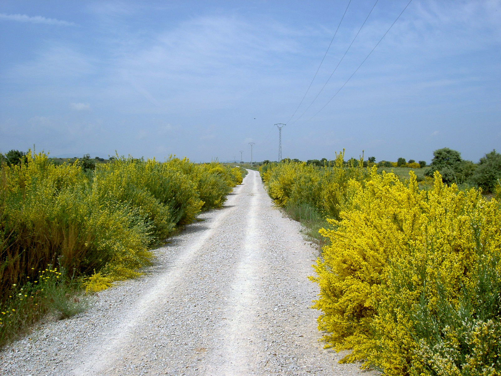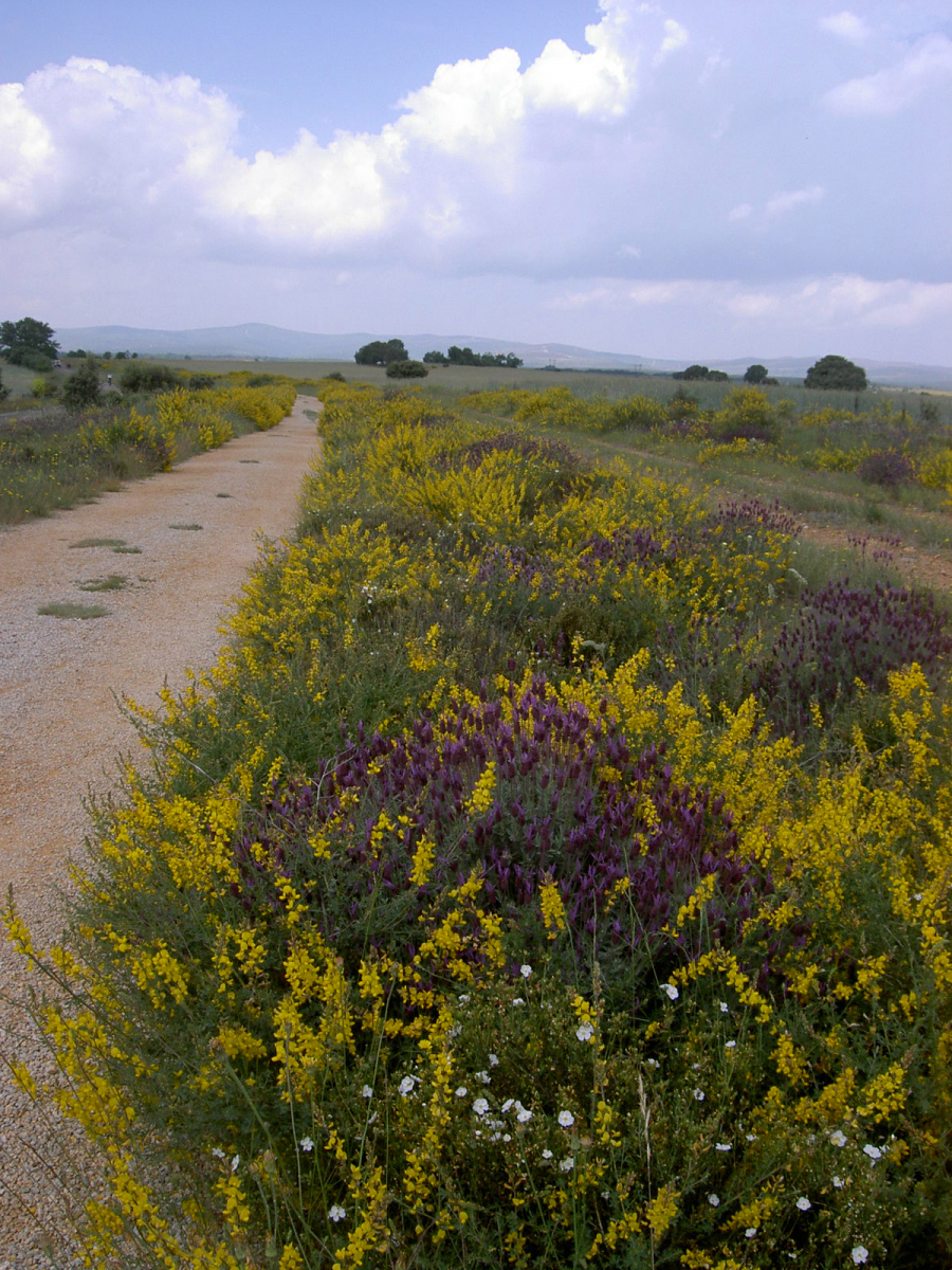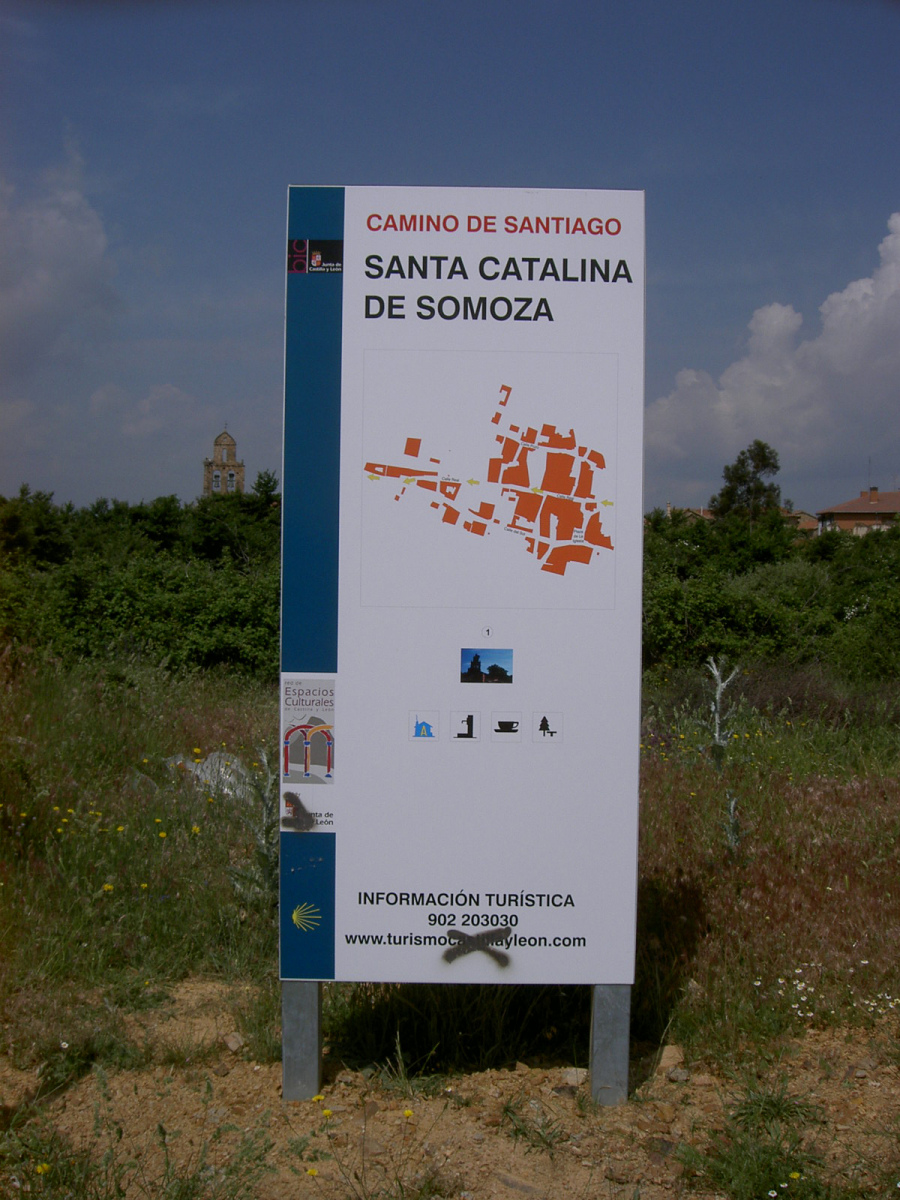 Dann Pilgerrennstrecke: Landstraße, daneben Grünstreifen 6m breit, dann Fußpilgerweg, frisch angelegt, wieder daneben noch ein Grünstreifen mit fast mannshohen Ginsterbüschen 3m breit, dann Radpilgerweg. Übermannshohe Orientierungstafeln, ohne wesentlichen Informationsgehalt. So kann man’s Geld aus Brüssel auch ausgeben. Separatisten aus Leon haben alle Hinweise auf Kastilien übersprüht.
