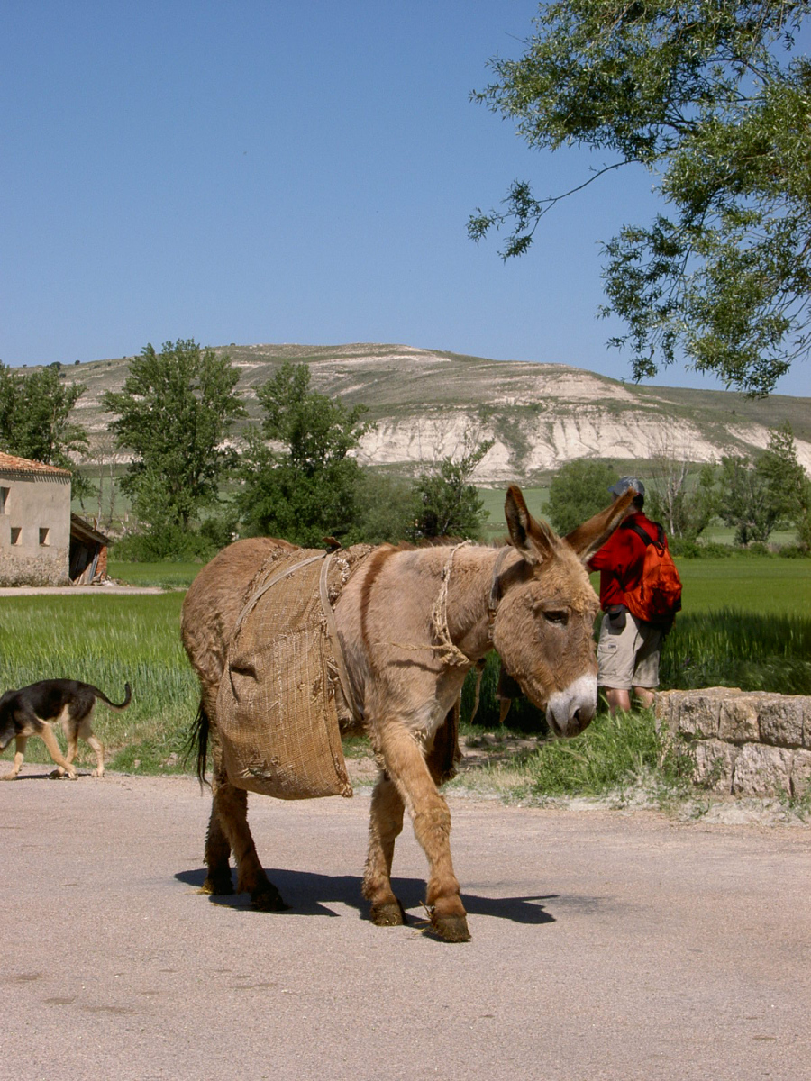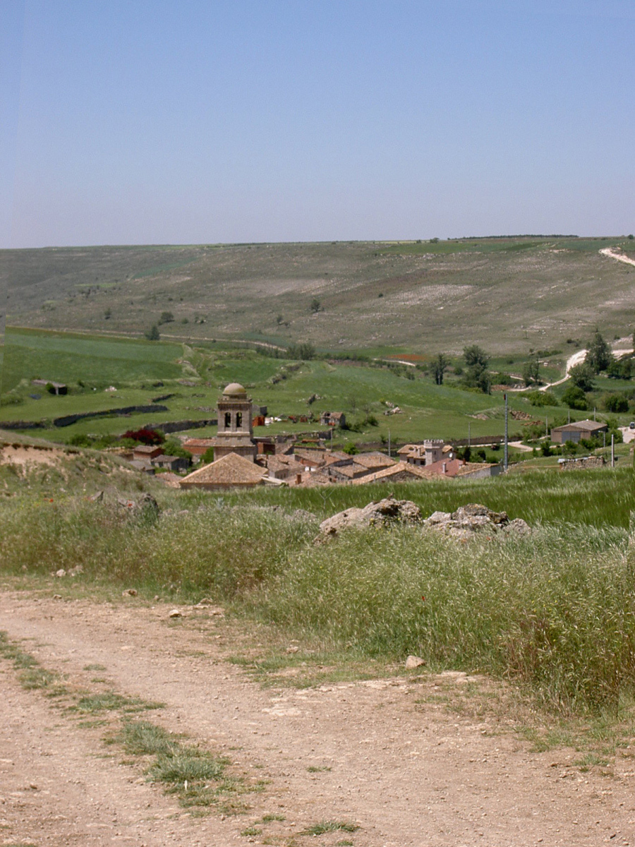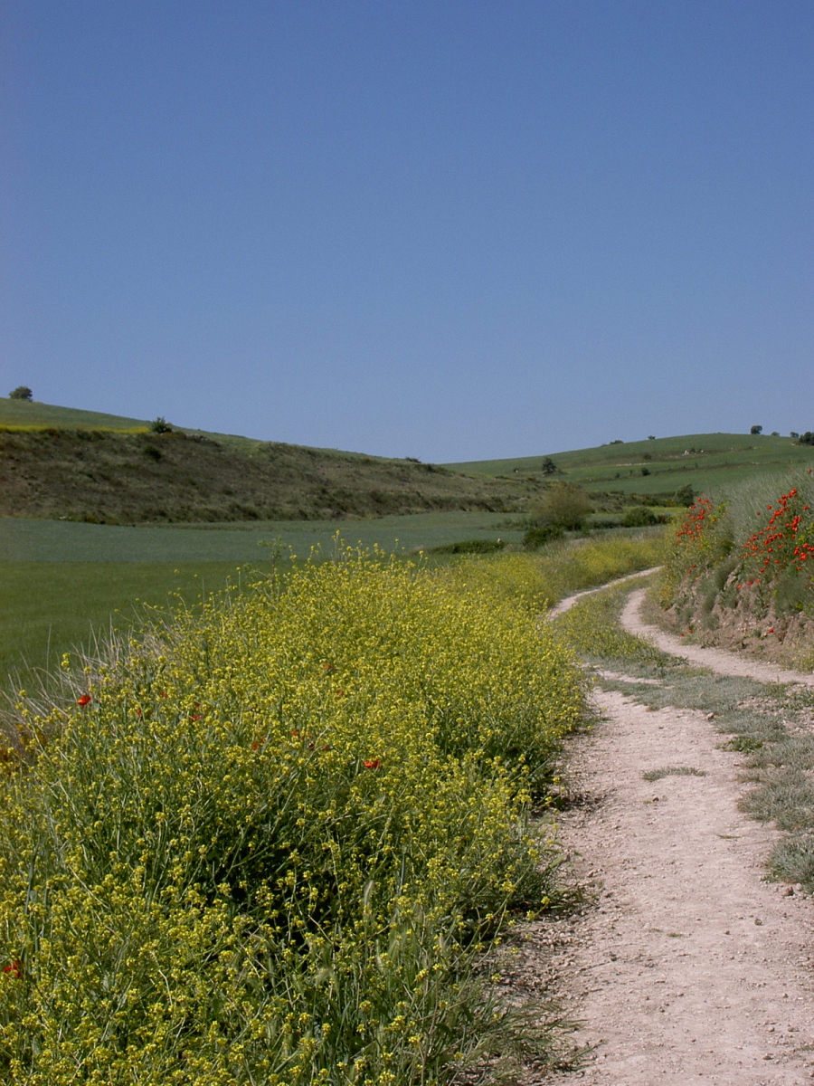 Dann rechts auf staubige Piste. Alle Autos fahren hier rücksichtslos zu schnell. Ich beschließe, in Straßenmitte zu marschieren, um die Fahrer zur Langsamkeit zu zwingen. Gelingt tatsächlich. Dann staubender Baustellenverkehr mit Großlastern bis Villabilla. Landstraße nach Rabe, geht flott, auch gegen die Laster. In Tardajos muss ich einkaufen, ist einziger Laden auf der ganzen Strecke heute. 3 Hefeteilchen mit kühler Vanillecreme verputz ich gleich. Schlängelpiste durch leichte Hügel nach Rabe de las Calzadas.