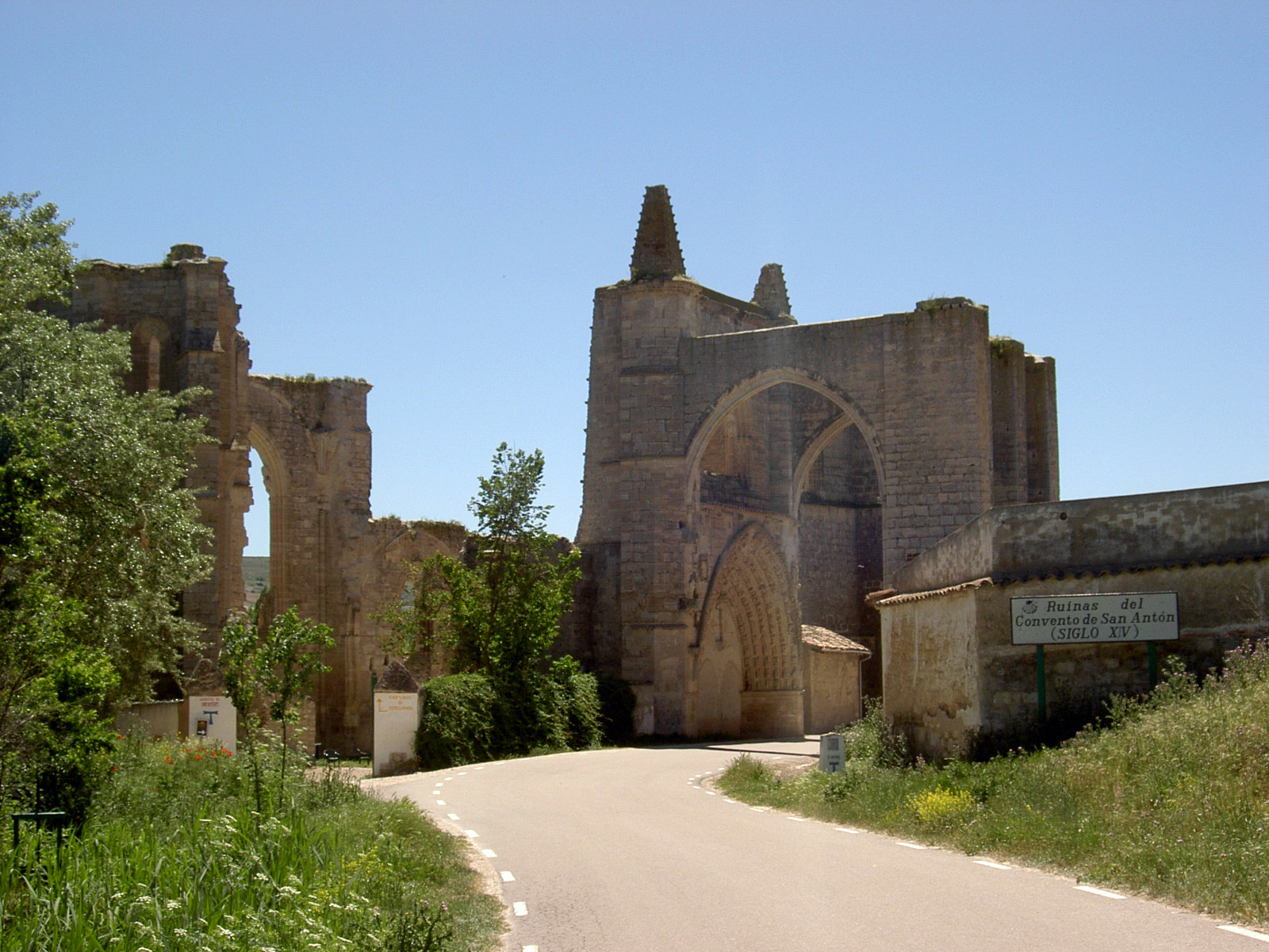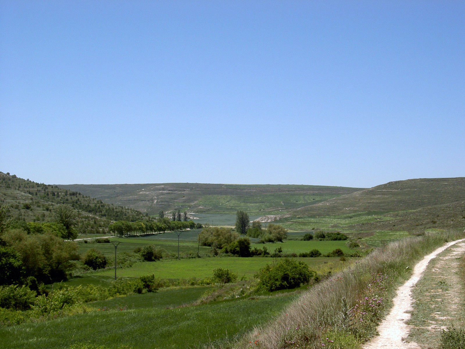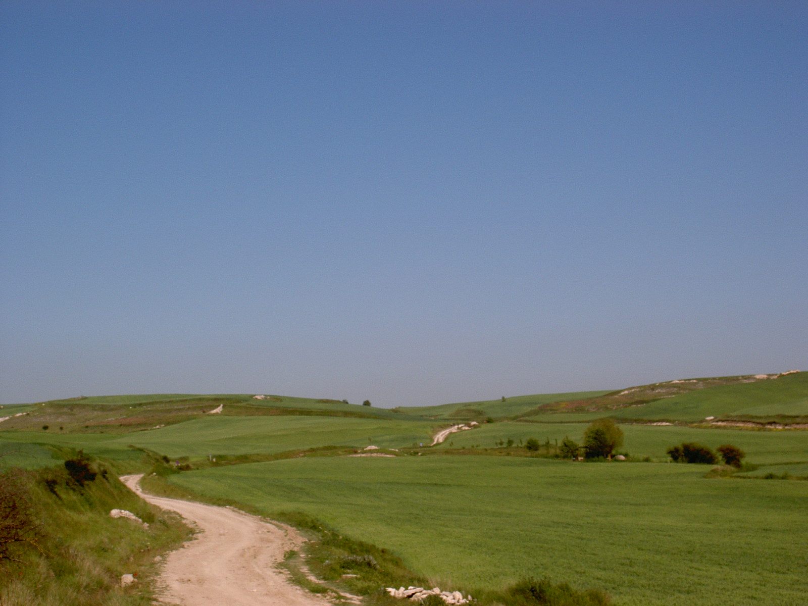 Dann rechts auf staubige Piste. Alle Autos fahren hier rücksichtslos zu schnell. Ich beschließe, in Straßenmitte zu marschieren, um die Fahrer zur Langsamkeit zu zwingen. Gelingt tatsächlich. Dann staubender Baustellenverkehr mit Großlastern bis Villabilla. Landstraße nach Rabe, geht flott, auch gegen die Laster. In Tardajos muss ich einkaufen, ist einziger Laden auf der ganzen Strecke heute. 3 Hefeteilchen mit kühler Vanillecreme verputz ich gleich. Schlängelpiste durch leichte Hügel nach Rabe de las Calzadas.