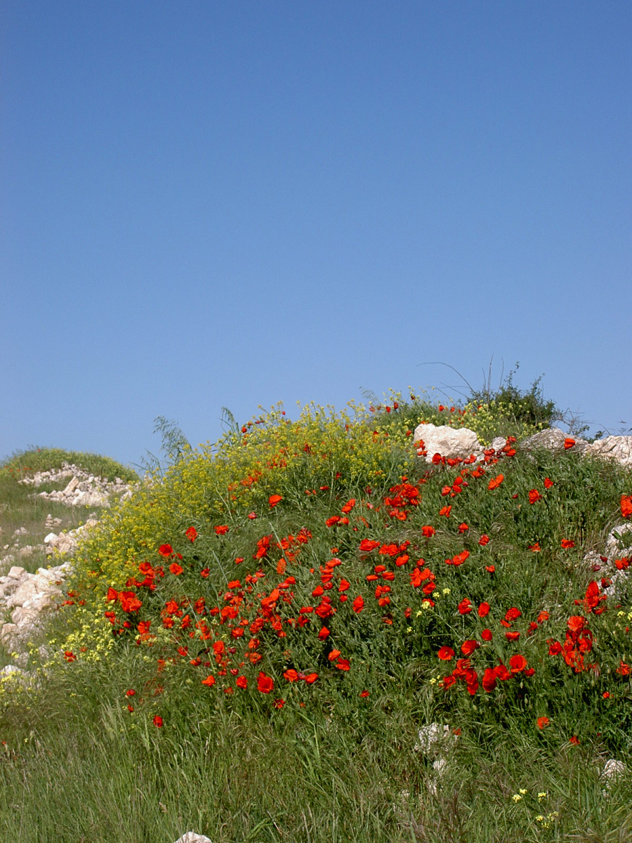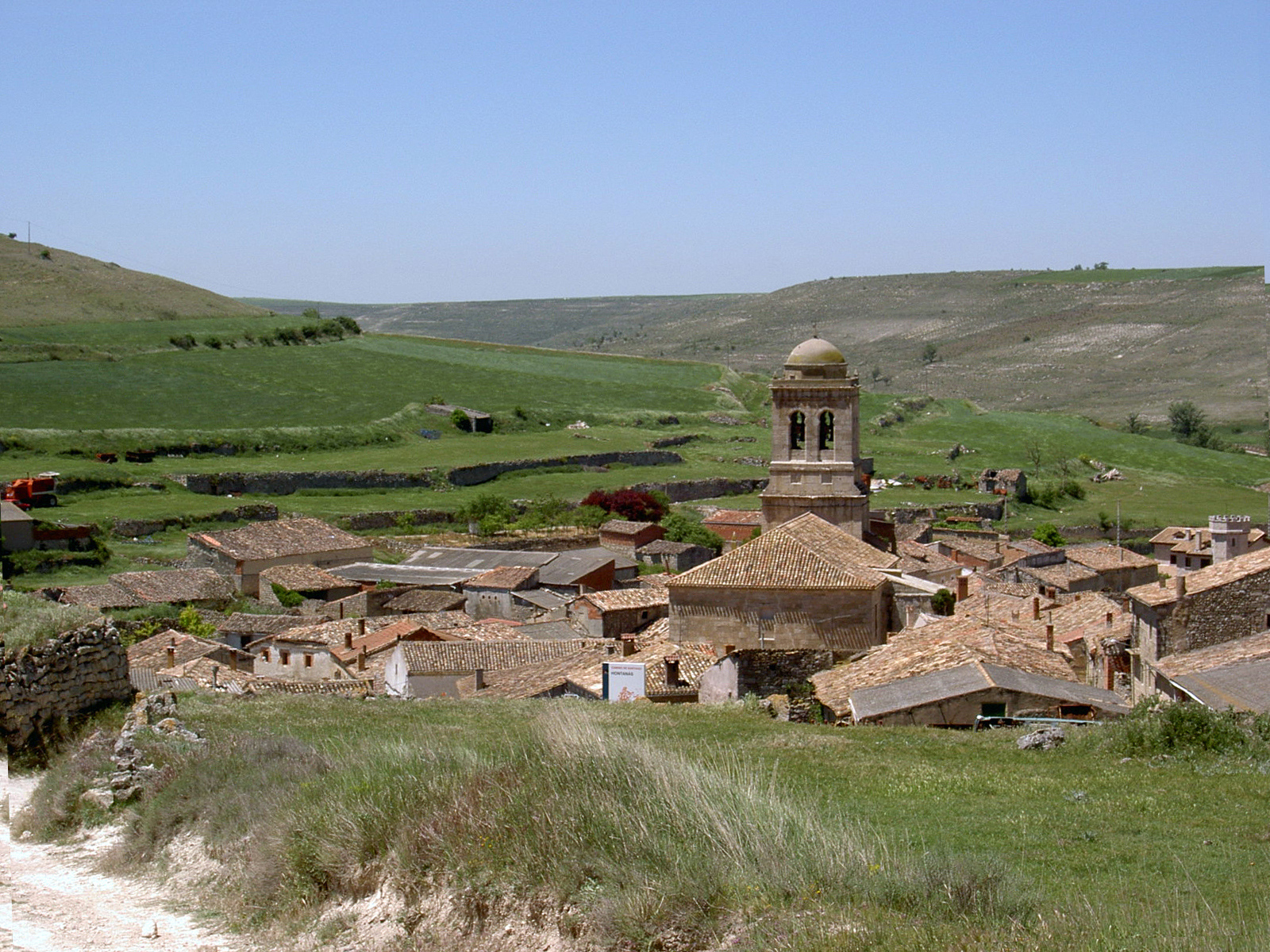 Links ein Schild: Hontanas 0,5 km. Wo soll das sein? Müsste ich doch längst sehen?! Vorne am Weg hat jemand offensichtlich einen kleinen tibetanischen Tempel aufgebaut; eigenartig in dieser Gegend. Der Tempel wächst rapide nach unten und entpuppt sich als die Glockenstube eines ausgewachsenen Kirchturms.