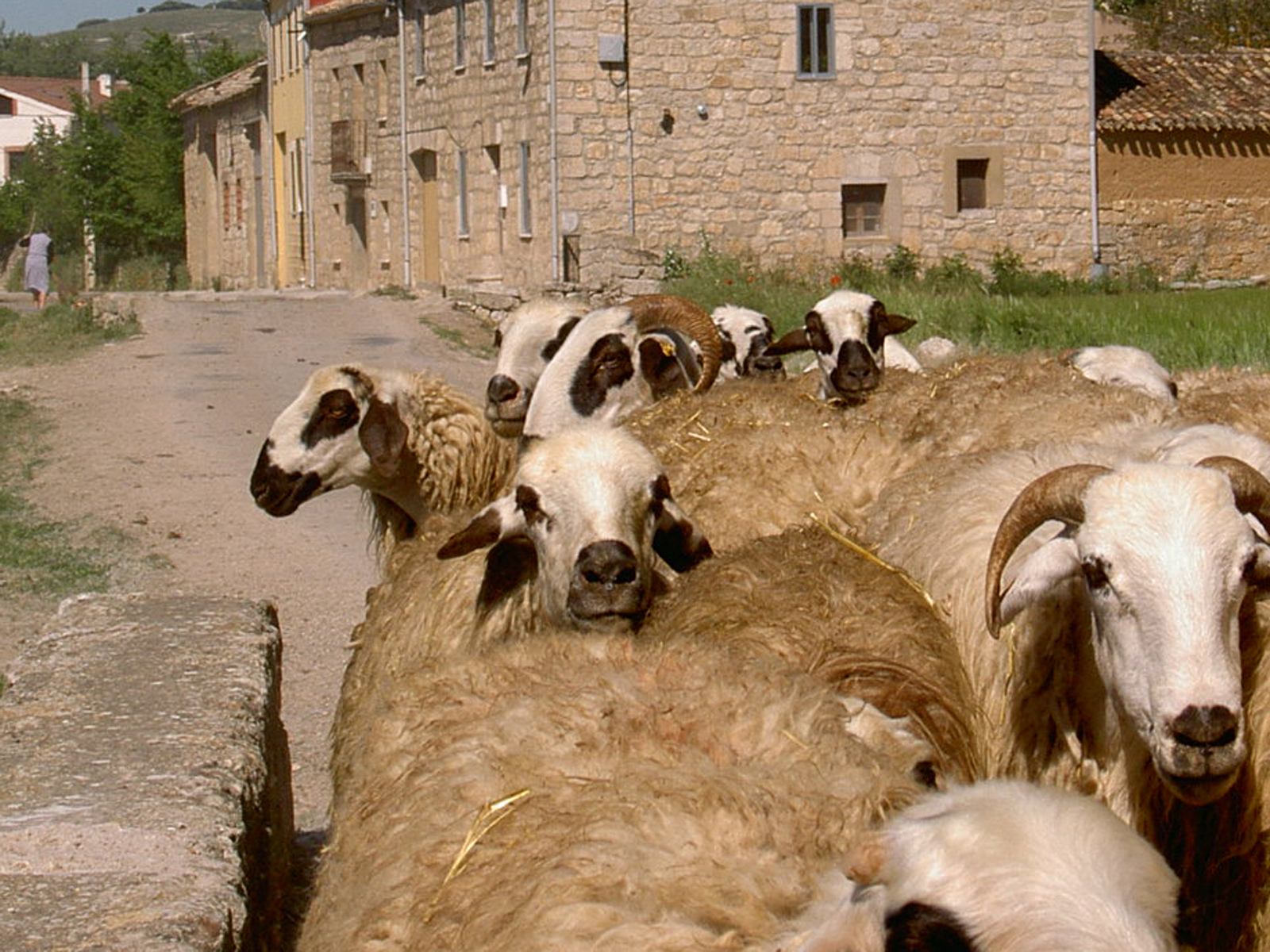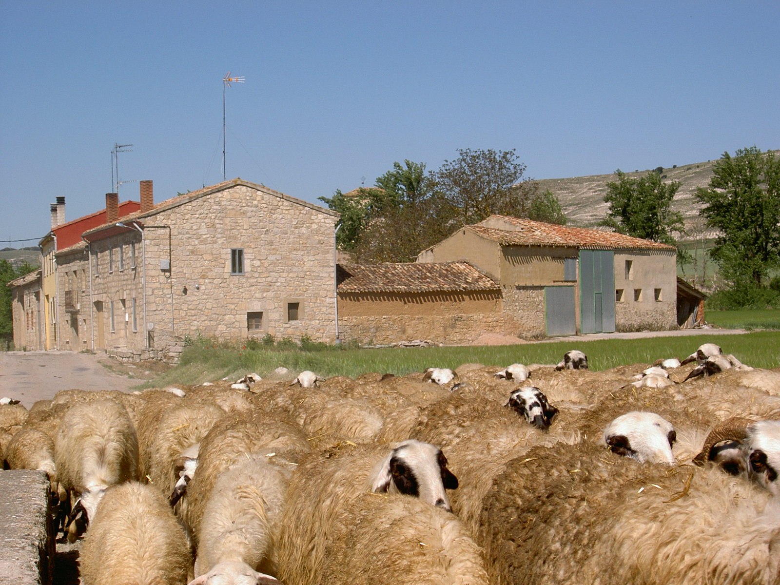 Gehe nicht den längeren Weg, der links schnurgerade in die Landschaft führt, muss meine Füße schonen. Über Hochebene langsam ansteigend nach Hornilles. Am Ortseingang Schafherde hinter geduldig zottelndem Esel. Eine Gruppe von 4 Franzosen kommt durch mich zu einem Gemeinschaftsfoto. Als ich dann die Schafherde fotografieren will, stellt sich einer von ihnen direkt vor mich, um selbst zu knipsen. Meinen vorsichtigen Protest versteht er aber sofort und springt zur Seite. Nach der Herde kehrt eine Frau die Knüddel weg (kann man links hinten am Ortsausgang erkennen).