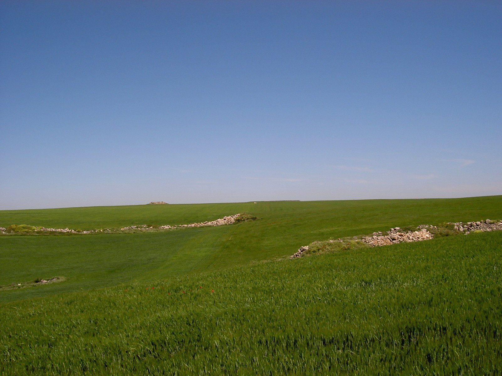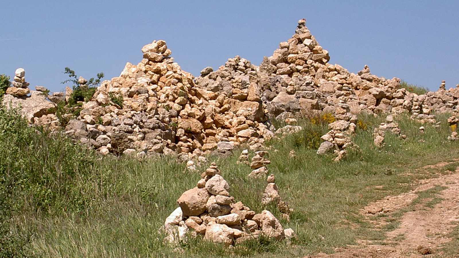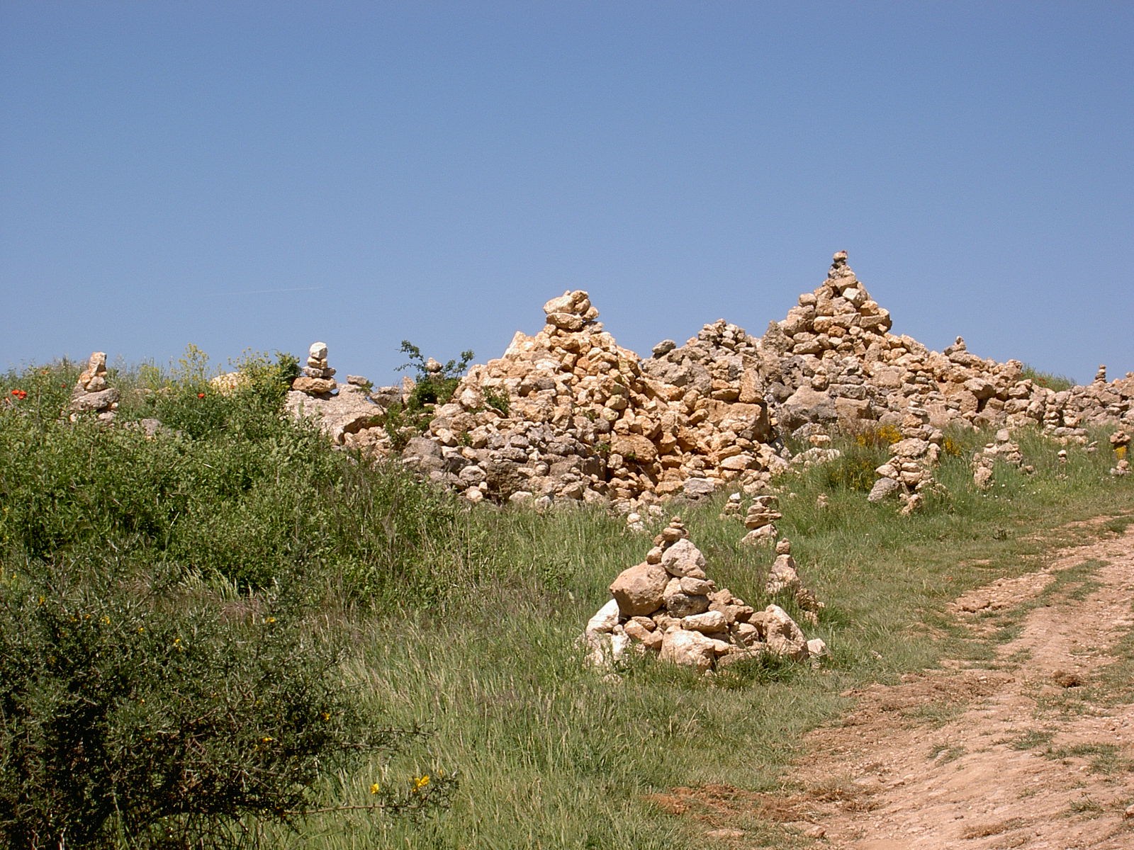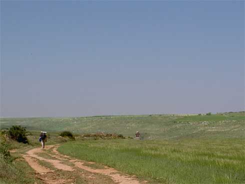 Endloser Weg auf endloser Hochebene. Beeindruckende Landschaft. Wind treibt Schäfchen über die Felder. Sehr einsam. Jakobspilger haben überall Steinmännchen gebaut.