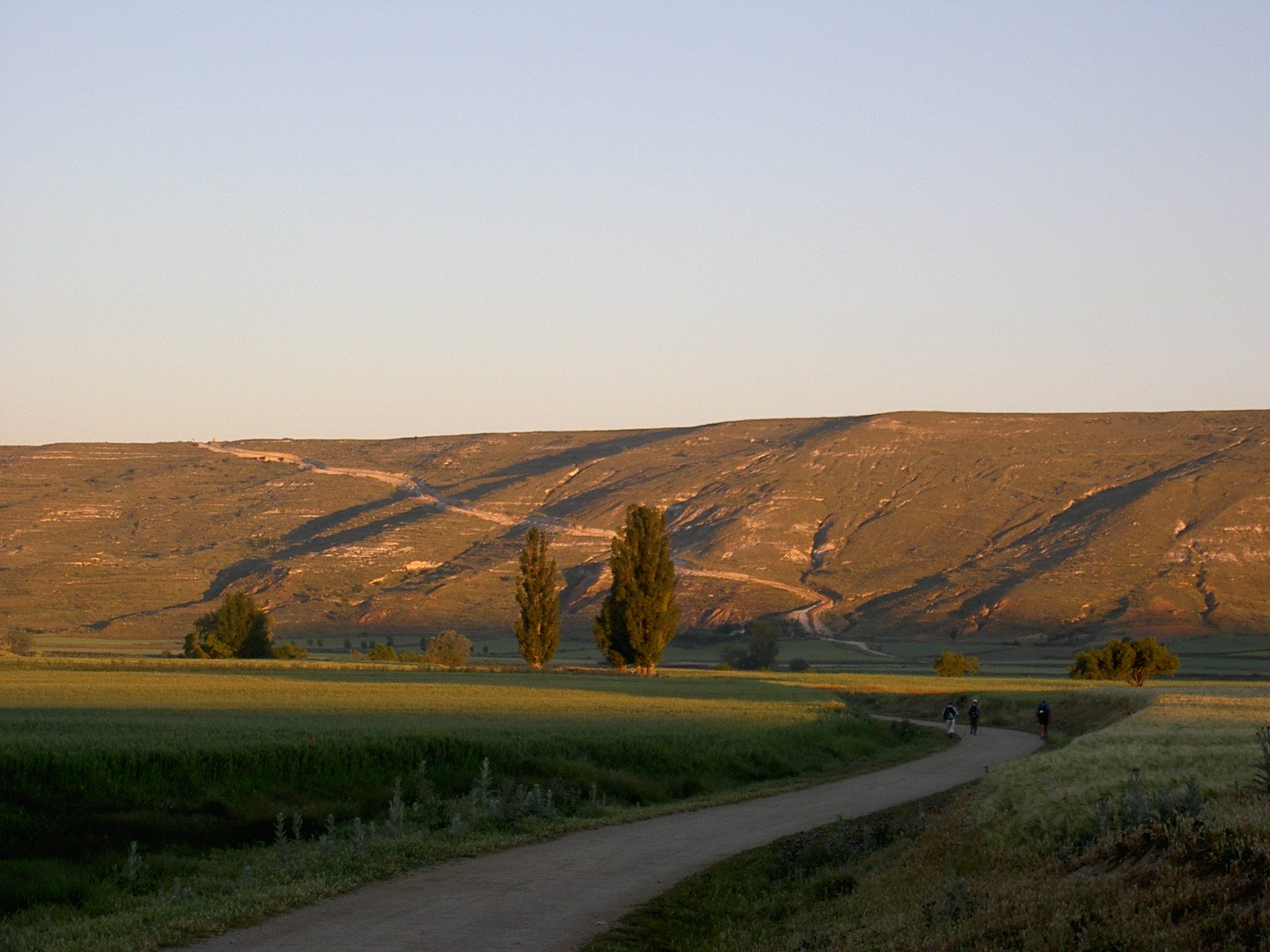 Auf in die Morgenkühle. Die aufgehende Sonne rötet die gegenüberliegende Talseite an die sich der Weg hinauf auf den Tafelberg schmiegt. Weiter Blick zurück über das Tal. Oben am anderen Rand des Tafelbergs sieht man weit ins Land auf die kommende Ebene. Immer wieder Mitpilger.