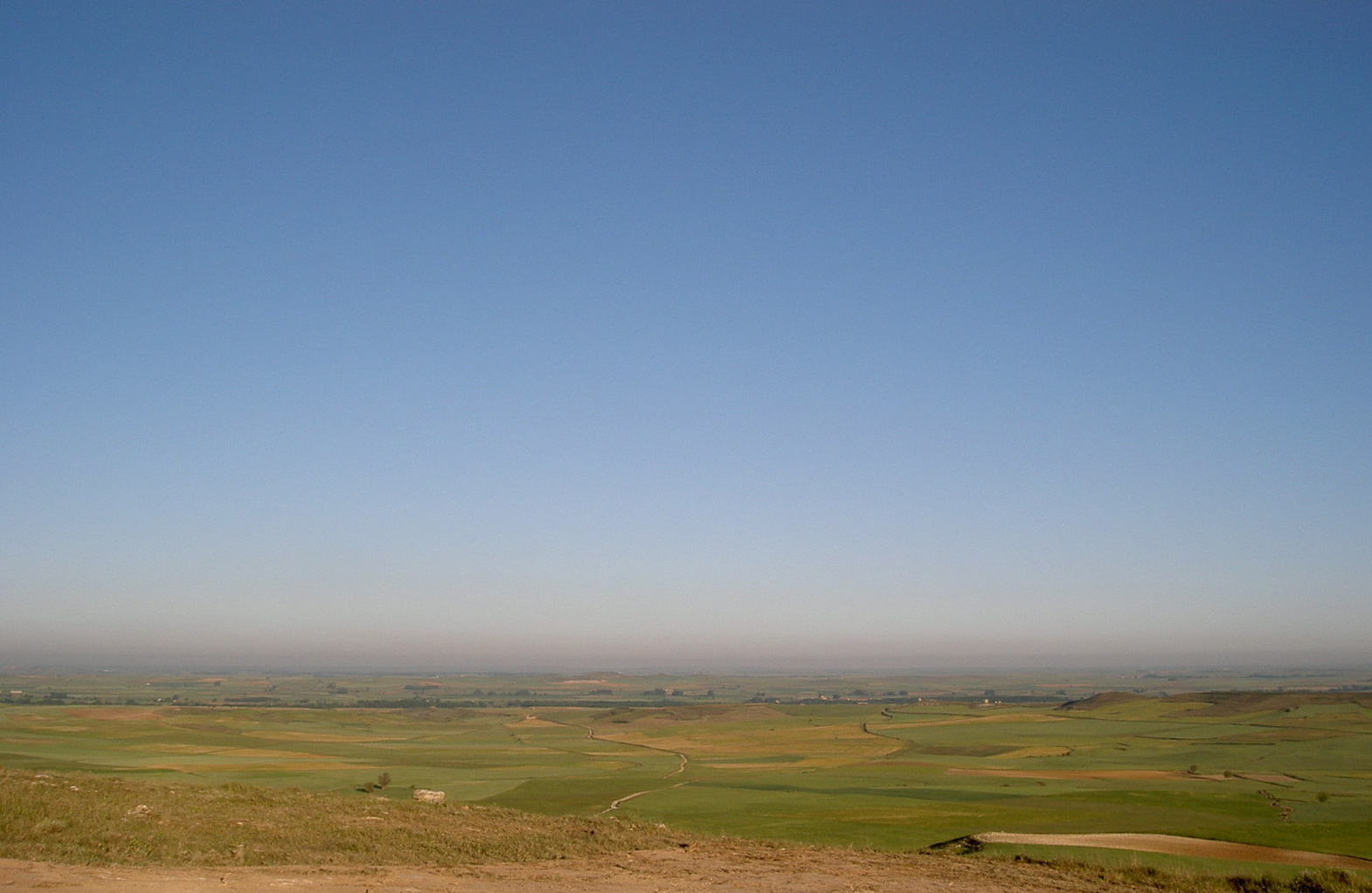 Nochmal Pause mit eiskalter Cola aus Herbergsautomat in Boadilla del Camino vor eindrucksvoller Kathedrale (zu). Immer wieder reizvoll geformter Horizont, der sich allerdings kurz vor Fromista entlang einem Kanal dazu entschließt, die Kurven bleiben zu lassen, ein Vorgeschmack auf die nächsten Tage.