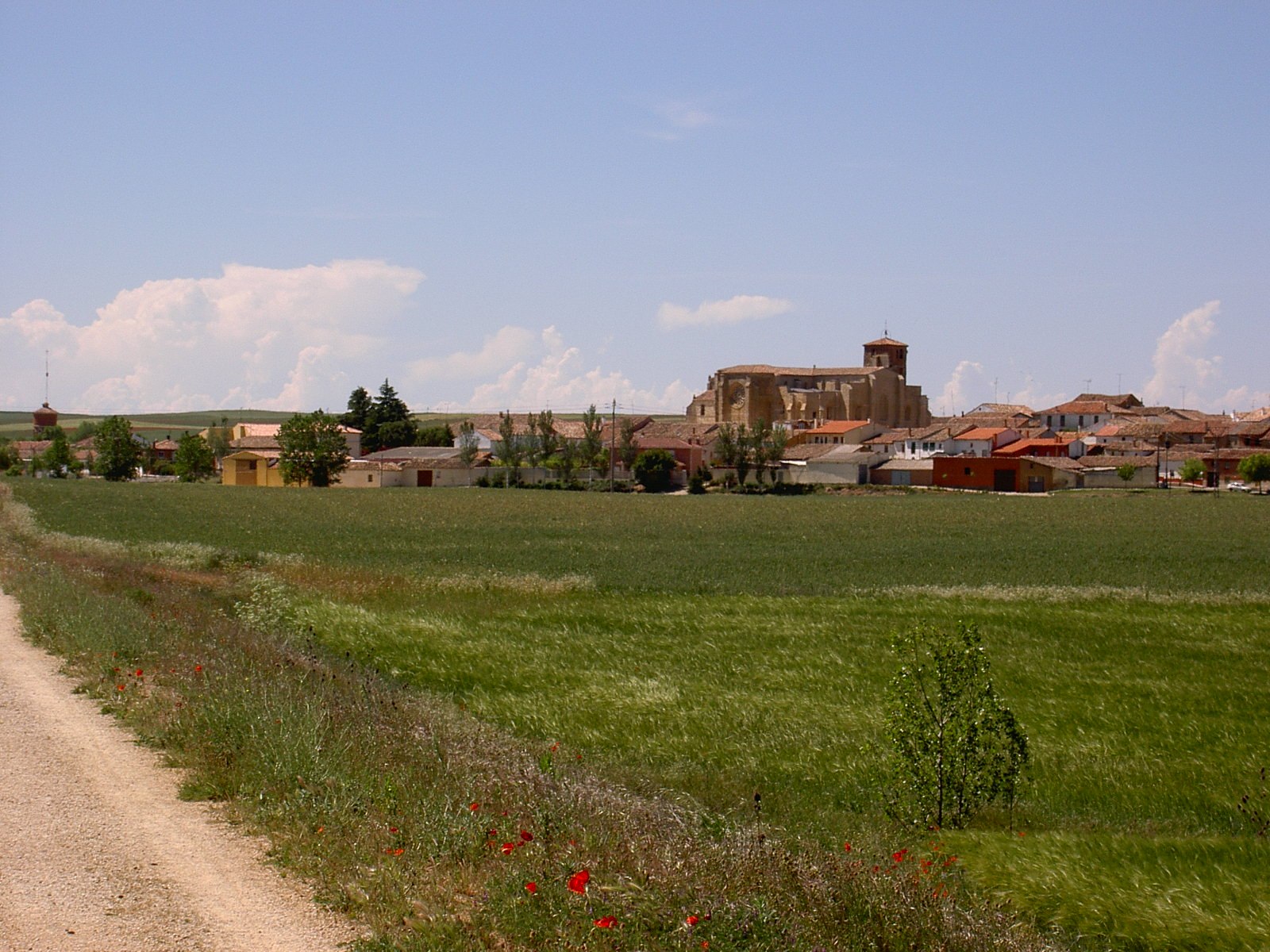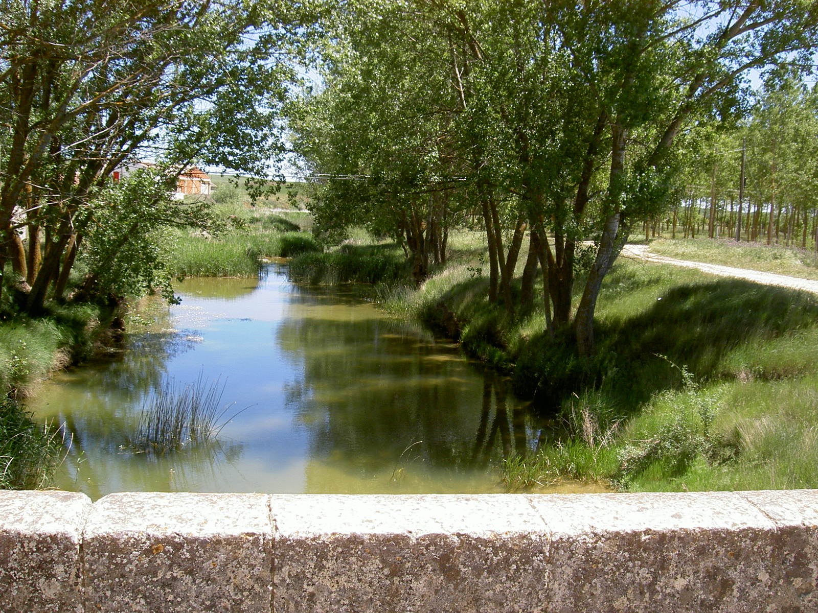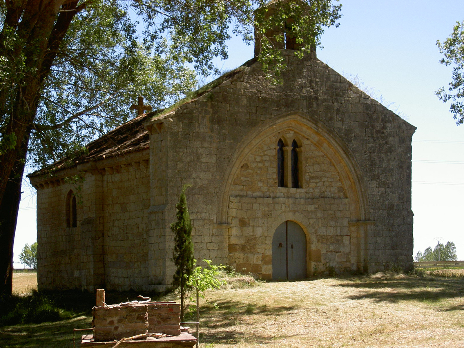 Vorbei an der Ermita de San Miguel, kurz nach Fromista, in Poblacion de Campos liegt eine kleine romanische Kapelle Ermita de nuestra Señora del Socorro ganz tief unterhalb der Straße, offen:       Laudate . Ein Nachbar sitzt vor seinem Haus im Schatten und schaut erstaunt. Nach langem Hatsch durch die Hitze an froschquakendem Stillwasser kleine Pause. Alter Spanier mitleidig: Ist doch viel zu heiß zum Wandern !