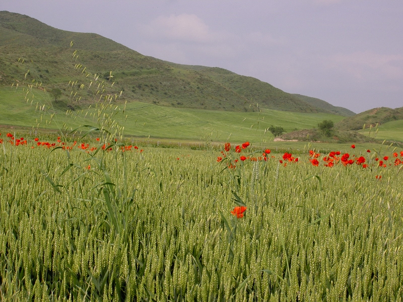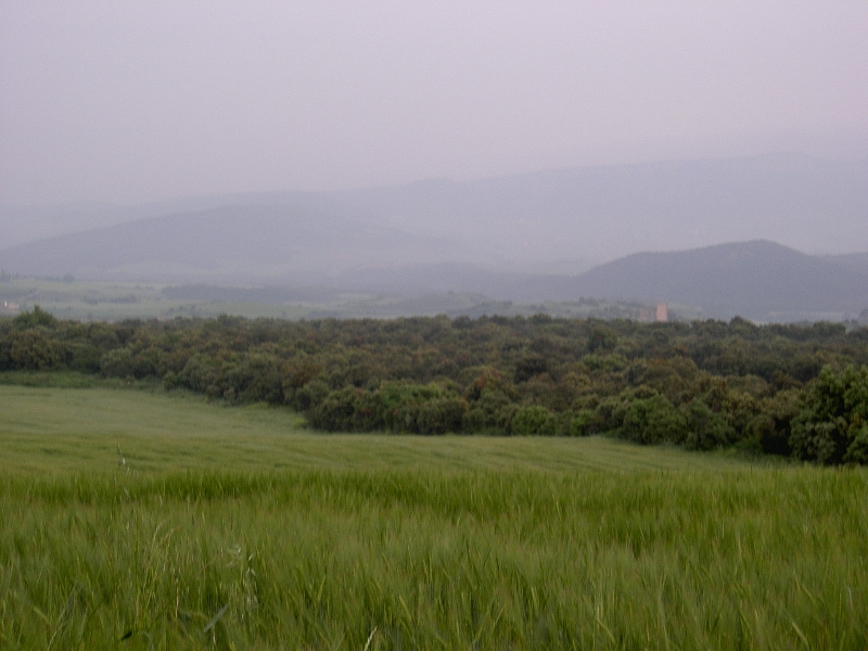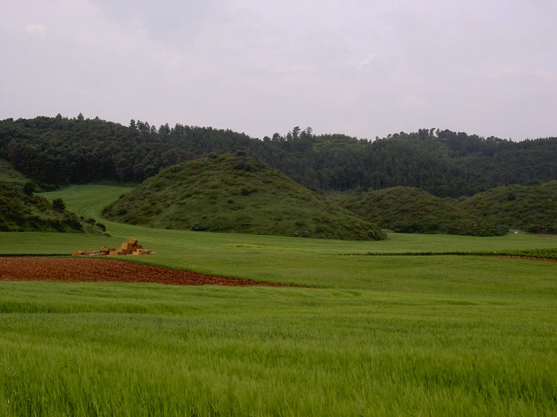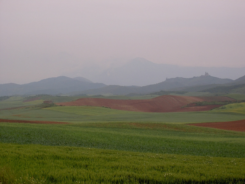 Weiter durch ein wundervolles weites Tal: links ein Höhenrücken, mit findlingartigen Ausläufern, Ginsterbeständen, Feldumkränzt, rechts geländewogende Felder in unterschiedlichen Grün-und Brauntönen, vorne im Dunst Berge, gekrönt mit alter Burg oder Kirche. Mohnpracht am Feldrand, leibhafte Landschaft.