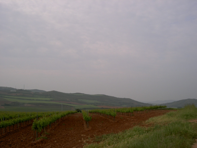Schöner Weg über Monjardin nach Los Arcos, ganz rote Erde, schöne freie Blicke ins Land. Um den Burghügel herum, am Maurenbrunnen vorbei (eine mit Gebäude gefasste alte Quelle) Piste, vom Tau etwas feucht.