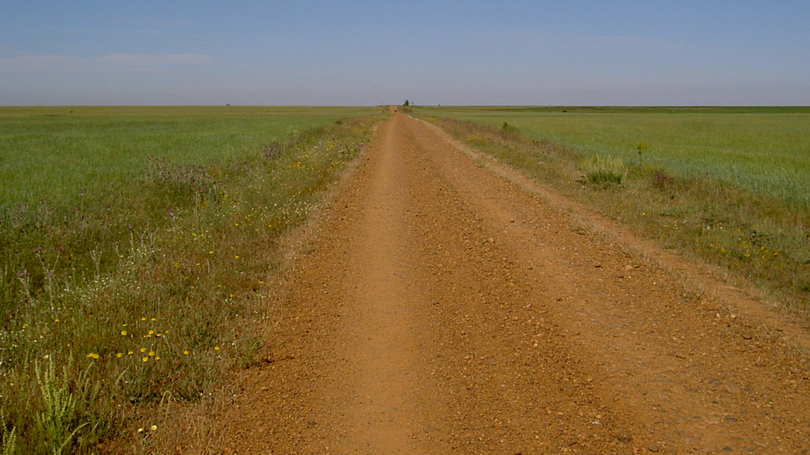 Kurz nach der Stadt beginnt eine 17 km lange schnurgerade Piste. Hier sind doch einige Pilger unterwegs. Ansonsten: Himmel, Horizont, Piste. Wenn im Sommer die Felder gelb sind, muss es trostlos sein. Ich gehe und gehe, es verändert sich nichts. Einige Pilger überhole ich. Diese Strecke scheint endlos. Vor mir auf dem Weg mein Schatten: wenn ich seine Mitte fixiere, scheint die Straße wie Wasser durch ihn hindurch zu fließen, Eindruck flotter Geschwindigkeit, Schattenwasser. Das hilft etwas. Aufblickend gerinnt Alles wieder zu Stillstand.