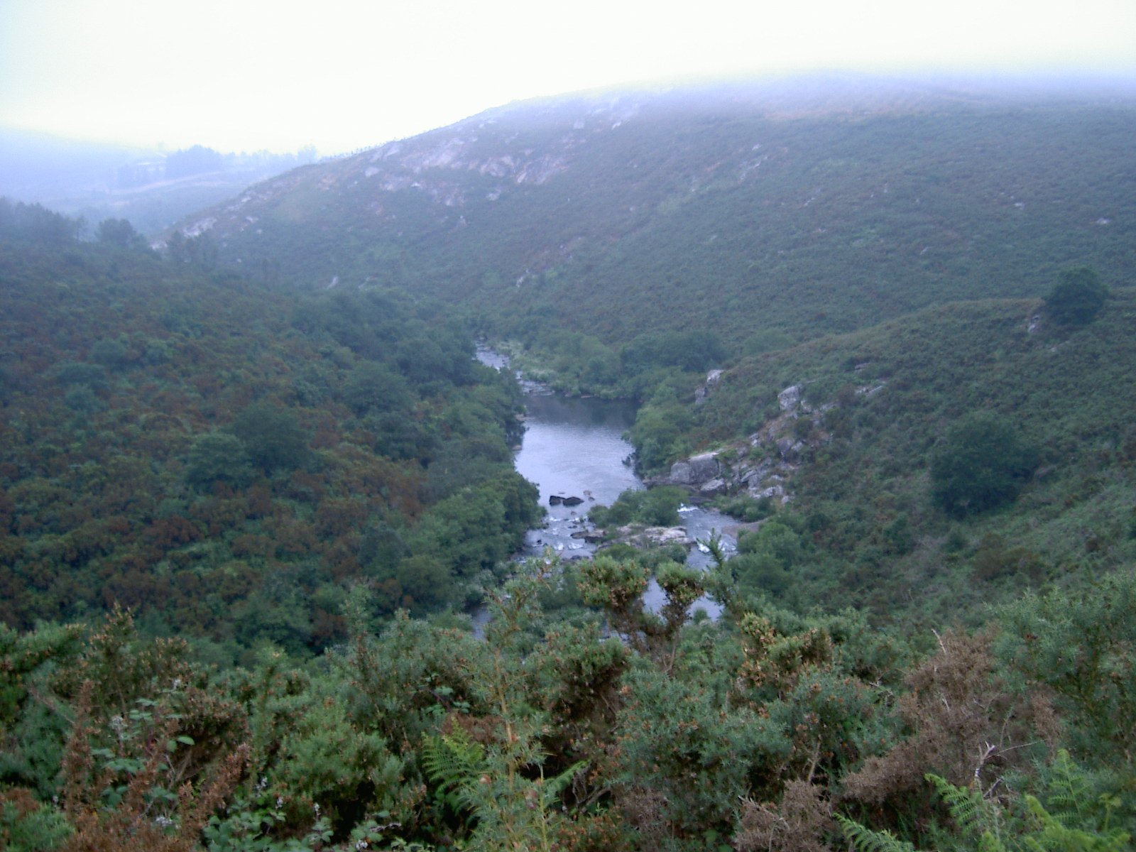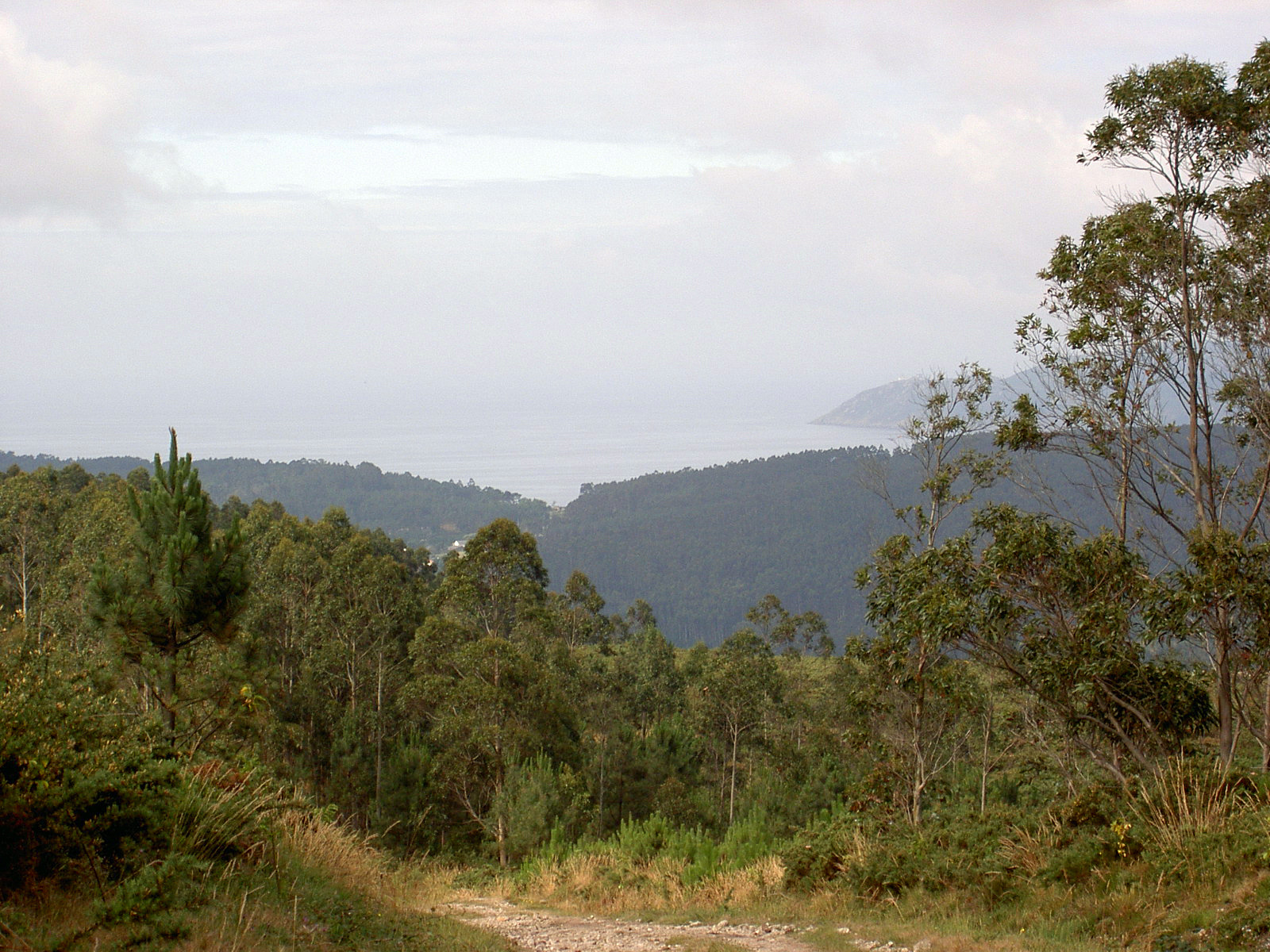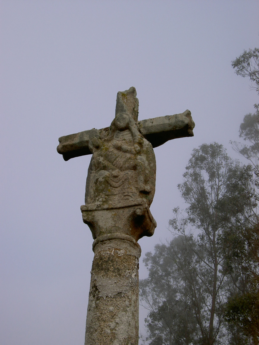 Im anderen Gebäude sitzen einige beim Frühstück, ich hab keinen Hunger, füll nur meine Wasserflasche und starte. Nebel auf einsamen Höhenwegen, schöner Blick hinunter zum aufgestauten Rio Xallas. Bei einer Industrieanlage, die aber in der dichten Suppe nicht zu sehen ist, Frühstückspause in einer Bar. Langsam trudeln weitere Pilger ein. Über magere Almen, der Himmel öffnet sich, ein altes Pilgerkreuz direkt an der Kreuzung des Pfades mit einer Landstraße, frisch hinauf auf weite Höhen, vielleicht wird das Wetter ja doch noch, den Sonnenuntergang am Kap Finisterre stell ich mir schön vor.