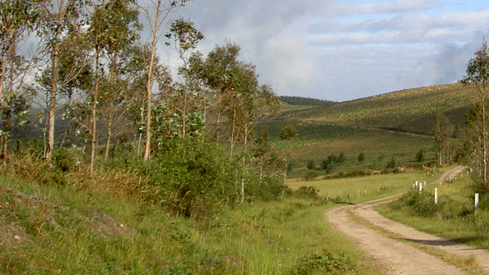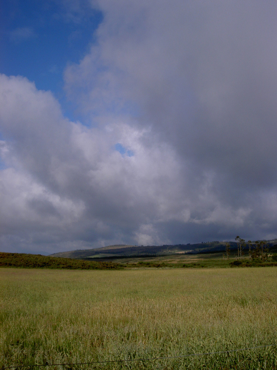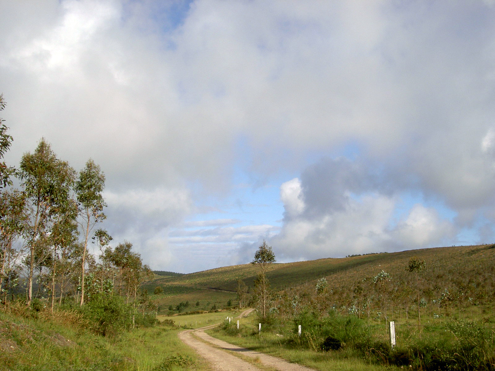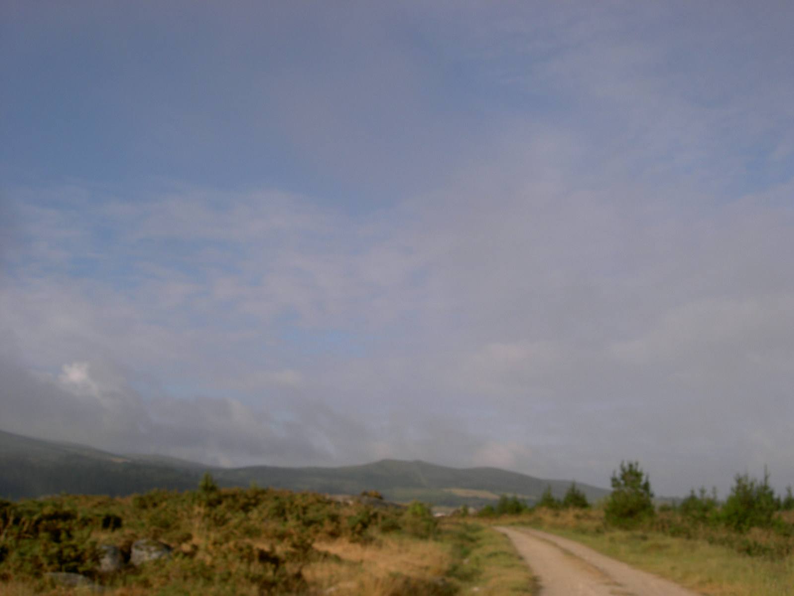 Im anderen Gebäude sitzen einige beim Frühstück, ich hab keinen Hunger, füll nur meine Wasserflasche und starte. Nebel auf einsamen Höhenwegen, schöner Blick hinunter zum aufgestauten Rio Xallas. Bei einer Industrieanlage, die aber in der dichten Suppe nicht zu sehen ist, Frühstückspause in einer Bar. Langsam trudeln weitere Pilger ein. Über magere Almen, der Himmel öffnet sich, ein altes Pilgerkreuz direkt an der Kreuzung des Pfades mit einer Landstraße, frisch hinauf auf weite Höhen, vielleicht wird das Wetter ja doch noch, den Sonnenuntergang am Kap Finisterre stell ich mir schön vor.