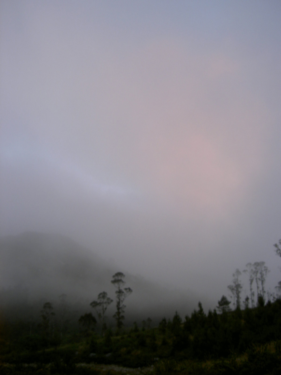 Rascheln, Taschenlampe, die ersten machen sich fertig. Ich warte noch ein bisschen, und stehe dann auch auf. Hab gestern meinen Rucksack schon so vorbereitet, dass das Packen im Dunklen flott vor sich geht. Als ich wanderfertig aus der Tür in den kühlen dunkelgrauen Morgen trete, merke ich, dass ich meine Brille am Bett vergessen habe. Zurück in den Schlafraum, ich halte die Luft an, wegen der Fliegen sollten die Fenster geschlossen bleiben.