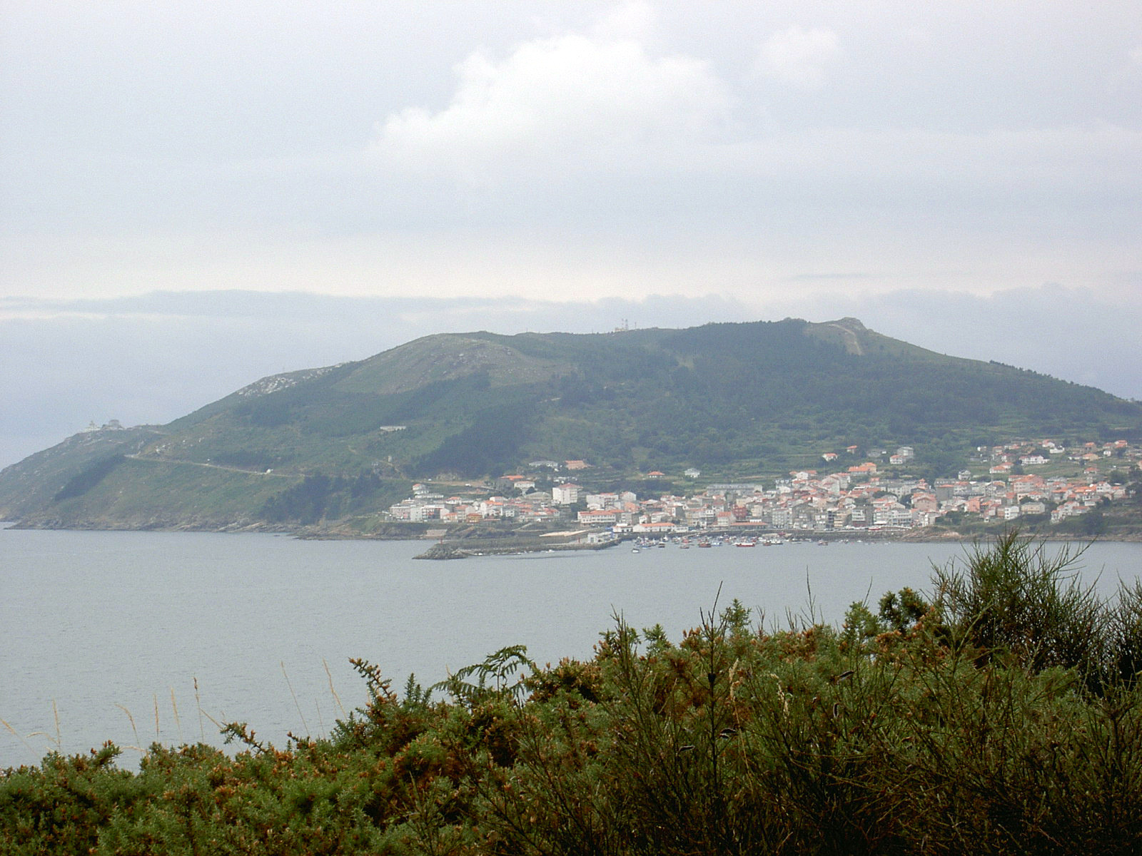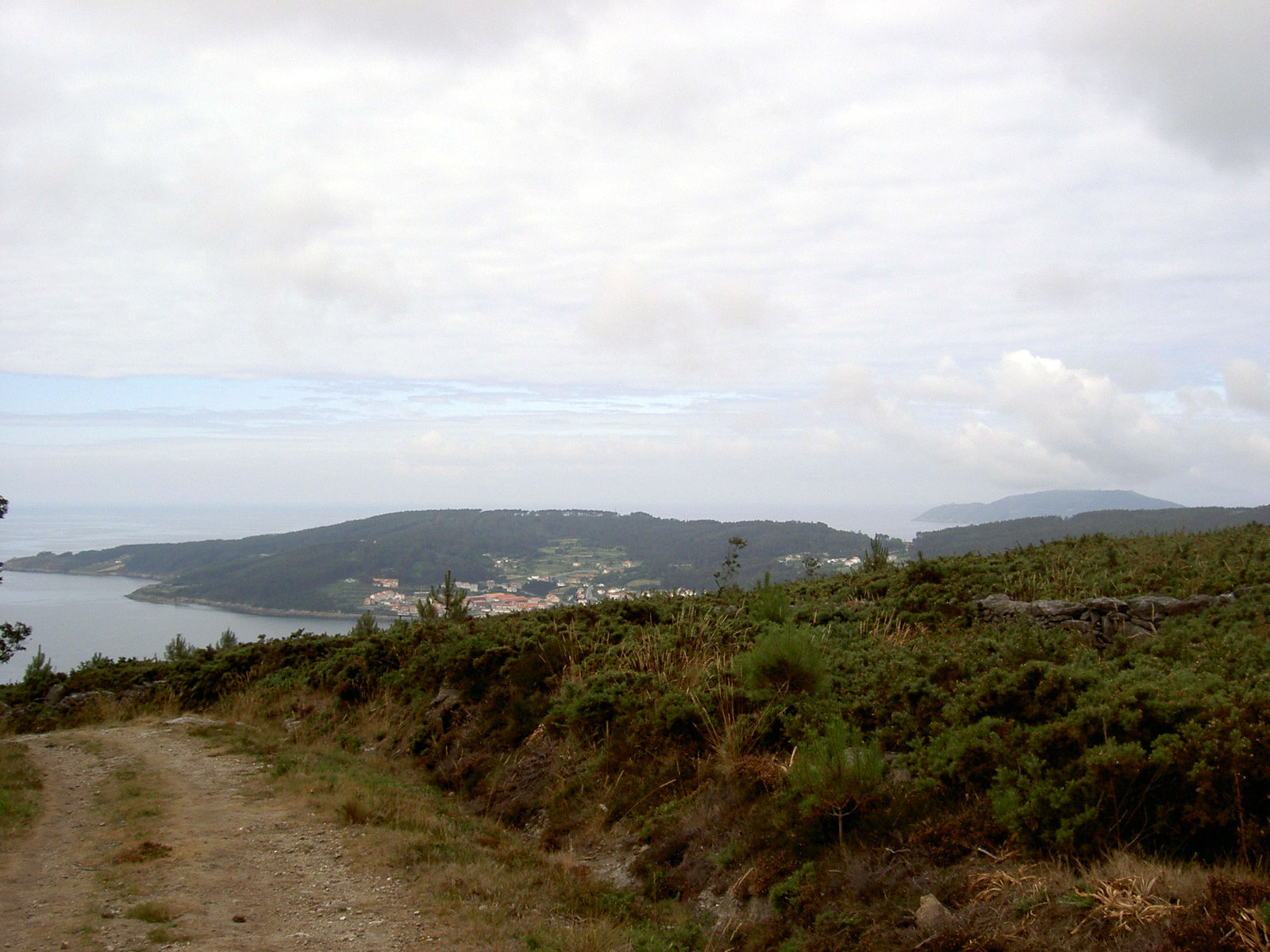 Über Höhenrücken mit Antennenmast. Als ich oben bin liegt vor mir der Atlantik, vorne die Bucht von Cee, ganz rechts hinten, das muss Finisterre sein. Ich versuche, Euphorie in mir zu erzeugen, es geht nicht. Die Aussicht ist grandios, ich genieße sie, aber mehr auch nicht. Steiler Weg hinunter nach Cee, sehr heiß. Einkaufen in riesigem SB-Center. Im nächsten Ort Mittagspause an palmenbestandenem Platz. Als ich wieder starte, kommen mir Gläubige aus der Kirche entgegen. Die Gelegenheit: Laudate .