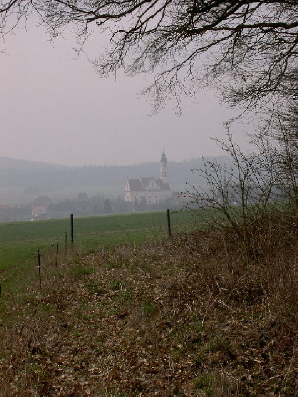 Raus aus der Stadt durch die herrlich nebel – sonnen – diesigen Auen der Roth, einem Nebenfluss der Riss. Dann verlasse ich den Jakobsweg, er scheint mir direkt nach Steinhausen zu viel über Straßen zu führen und nehme den E15, der ist zwar erheblich länger, geht aber über menschenleere Höhen, und nähert sich Steinhausen dann von oben. Im Dunst grüßt die imposante Dorfkirche. Die Beine tun mir weh. Neben der Kirche Rast mit Apfelsaftschorle in den schwäbischen Stuben mit norddeutscher Wirtin. Weiter in den heiß werdenden Mittag, hinauf auf die Anhöhe über Lauhaus.