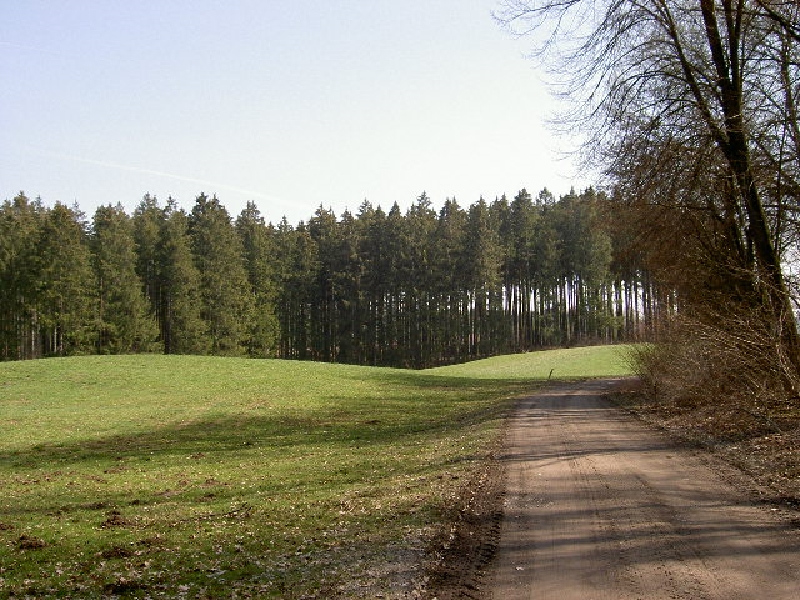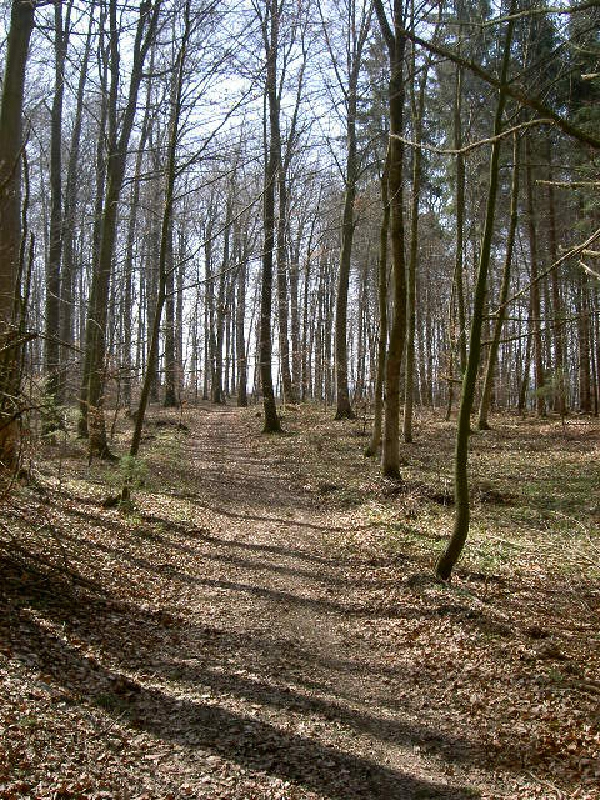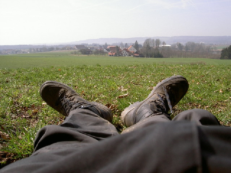 Am Aussichtspunkt bin ich doch so erschöpft, dass ich eine lange Rast einlege und eine halbe Stunde richtig schlafe. Über mir filigrane Äste vor einem stahlblauen Himmel, vor mir meine müden Füße und der herrliche Blick über Lauhaus hinweg in die Weite Oberschwabens. Erfrischt geht’s auf einem Feldweg am Waldrand weiter, durch einen durchsonnten Wald.
