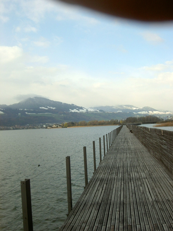 Langer, schöner Weg über den Holzsteg und dann über den Damm durch den Zürichsee.