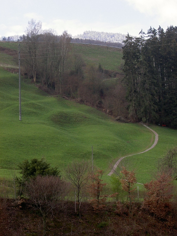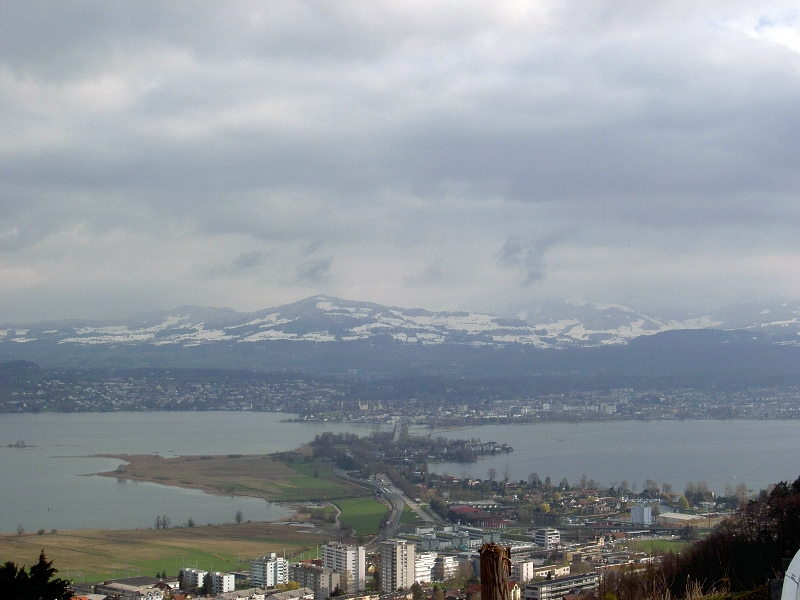 Durch Pfäffikon, schnüre meine Stiefel nach, alter Schweizer: “Na, ham’s an Schua v’lora?” (Ha, ha ha, soll Schyzerdütsch sein), steiler Anstieg am südlichen Seeufer. Steil hinauf in der Diretissima, ca. 300 Höhenmeter. Ich komme ordentlich ins Schwitzen. Herrlicher Blick zurück auf den Zürichsee und die dahinterliegenden Berge, aus denen ich gestern gekommen bin.