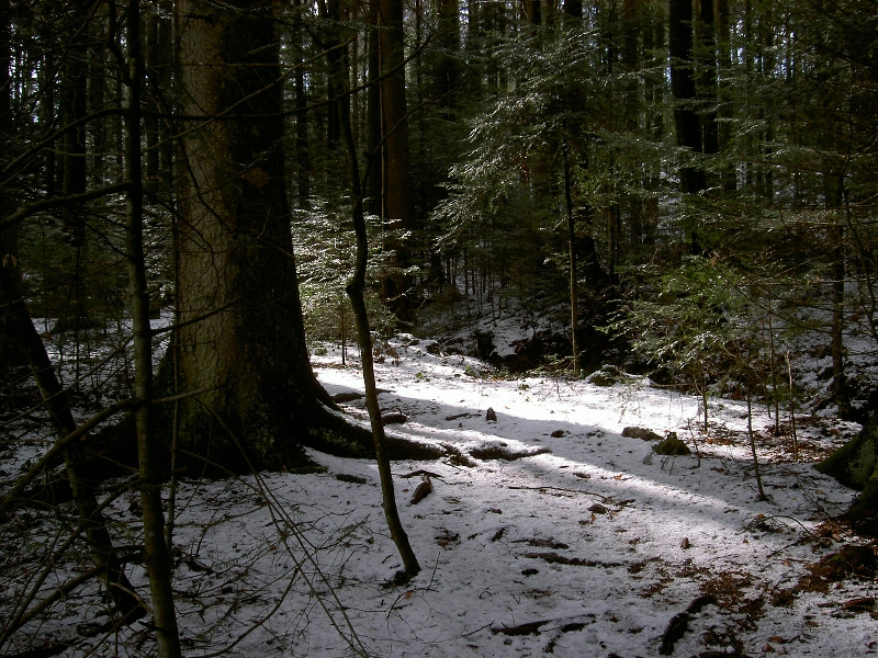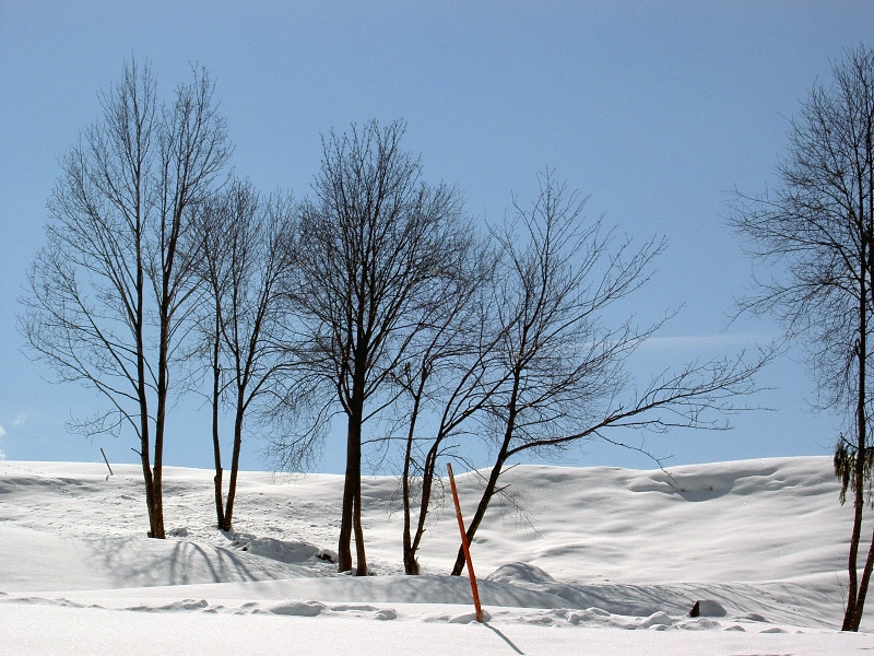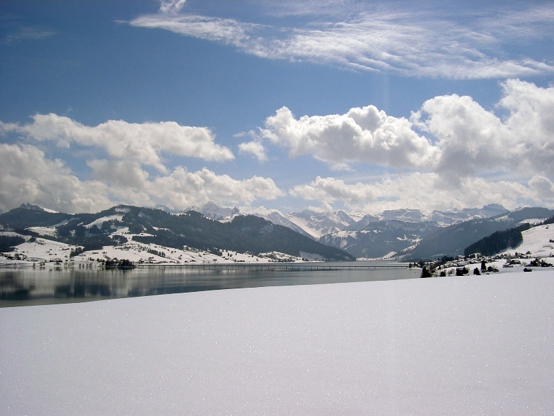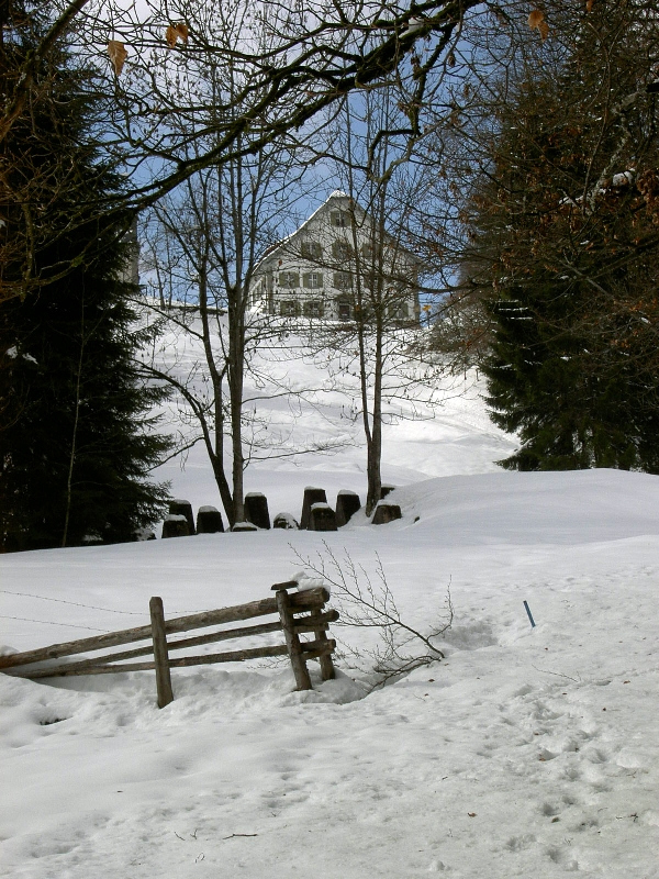 An der Teufelsbruck herrlicher Geruch nach warmem Kuhstall, frischem Heu und einem Schuss Silagedunst. Weiter durch die Mittagssonne und schneeige Luft nach Einsiedeln.