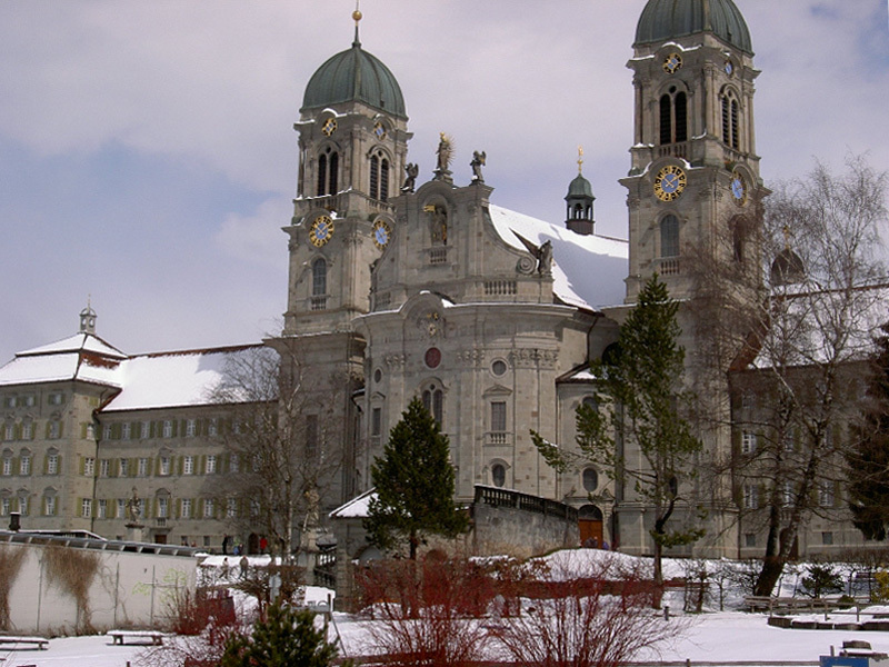 Schönes Zimmer. Ich mache eine Klosterführung mit, bin der einzige Gast. Die Bibliothek ist sehr licht, weiß mit leichtem Grün und rosafarbenen Portraitmedaillons in den Fensterlaibungen: Alle Päpste gucken nach Osten, alle Kaiser nach Westen. In der Kirche von Einsiedeln ein Wallfahrtsschrein mit der schwarzen Madonna.
