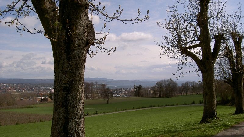 Durch Kreuzlingen hindurch, das südliche Seeufer hinauf. Wundervoller Blick zurück zum Bodensee. Durch lichte Wälder und freundliche Höhen und Felder nach Amlikon. Kurz vorher mach ich noch eine lange Rast zwischen frisch gefällten Buchenstämmen, die halten den scharfen Wind ab, besudeln aber mit ihrem Harz meinen Anorak.